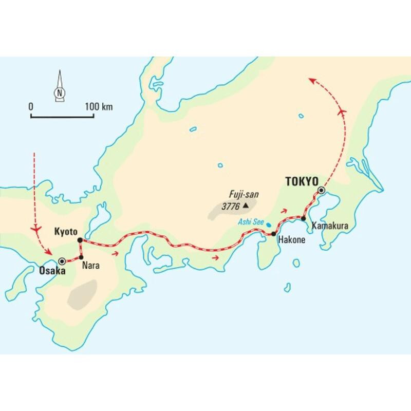 Wanderreise entlang der Küste der Insel Honshu von Osaka bis TokyoAuf den ersten Blick ist Japan rot. Rote Torii, rote Schreine, rote Siegel, rote Postkästen und die rote Sonne der Nationalflagge. Bei genauerer Betrachtung wird aber klar, dass der Inselstaat in Wahrheit kunterbunt ist. Ein Meer aus Farben und Färbungen, ein Land voller Fakten und Gegensätze. Schlichte Zen-Ästhetik trifft auf blinkende Leuchtreklame, stille Teezeremonien konkurrieren mit singenden Getränkeautomaten, futuristische Roboter agieren neben traditionellen Ryokans. Genauso farbenfroh wie Natur und Architektur sind auch Geschmack und Geschmäcker: Frittierte Bienenlarven, Thunfisch-Eis, Schoßhündchen im Kimono, tiefe Verbeugungen beim Telefongespräch – das kulturelle Erbe lebt unter der Oberfläche der Moderne weiter und Geschichte und Gegenwart verschmelzen in Japan zu einer exotisch-dynamischen Einheit. Wir wandern auf dem Yamanobe-no-michi, dem ältesten Weg Japans, und lassen uns von den Farben der Kirschblüte oder des Herbstlaubes inspirieren. Wir streifen durch den dunkelgrünen Zedernwald im Norden Kyotos und erkunden den blühenden Nara-Park. Wir düsen mit dem weißen Shinkansen in Windeseile ans blaue Meer, gleiten mit dem Boot über den türkisfarbenen Ashi-See und nehmen die Seilbahn zum Fuß des Kami-Kraters. In Nara widmen wir uns den vergoldeten Statuen, in Yoshino den heiligen Schreinen und in Kamakura den buddhistischen Tempeln. Im Fuji-Hakone Nationalpark dominiert der Fuji mit seiner Schneekappe die Kulisse und wir genießen den Anblick, bevor wir uns in den Großstadtdschungel Tokyos stürzen. Japan – ein kunterbuntes Potpourri der Kontraste.