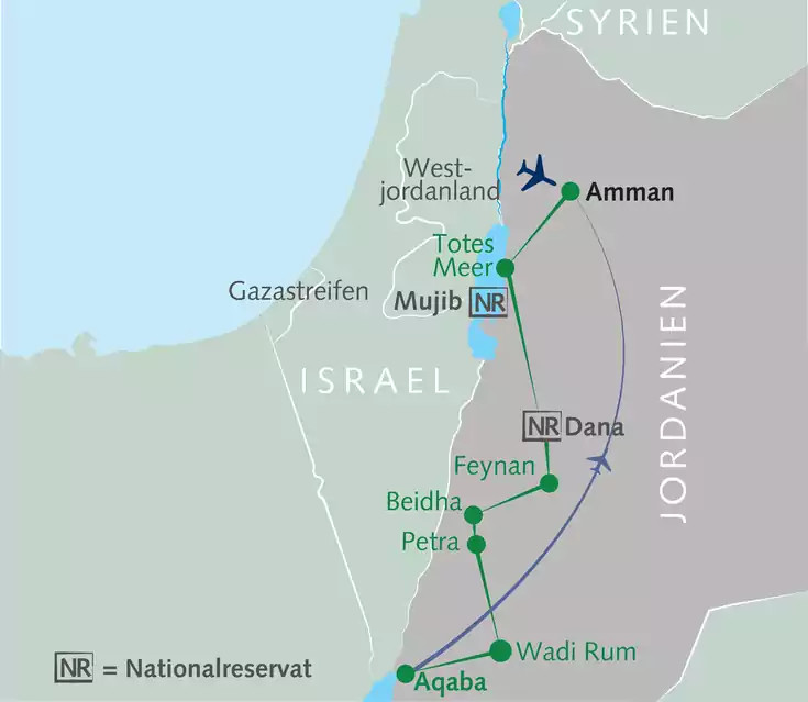 10. Tag: HeimreiseTransfer zum Flughafen Aqaba und Rückflug. Ankunft am selben Tag. 10 km. (F)