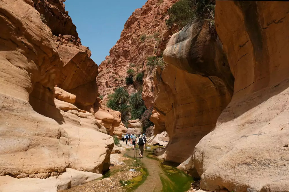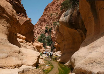 2. Tag: Wadi Mujib & Safi KitchenLet the fun begin! Im Mujib-Reservat, dem tiefstgelegenen Biosphärenreservat der Erde, entdecken wir den „Grand Canyon Jordaniens“. Wir waten durch den Fluss Wadi Mujib, der sich einige Kilometer durch eine tiefe Sandsteinschlucht windet. Kleine Wasserfälle überqueren wir über Felsen und Leitern. Je nach Saison können wir in den natürlichen Pools des Canyons ein erfrischendes Bad nehmen und uns auf dem Rückweg einfach treiben lassen. GZ ca. 3 Stunden. Inzwischen hat die Mittagssonne die Felswände in ein herrliches Gold gefärbt. Weil Wandern hungrig macht, machen wir uns anschließend auf zur kleinen Farm "Safi Kitchen" im fruchtbaren südlichen Jordantal. Aus dem hier angebauten frischen Gemüse bereiten wir gemeinsam ein schmackhaftes, landestypisches Mittagessen zu. Zurück am Toten Meer können wir den Tag schwebend auf der Wasseroberfläche ausklingen lassen. 100 km. (F, M, A)