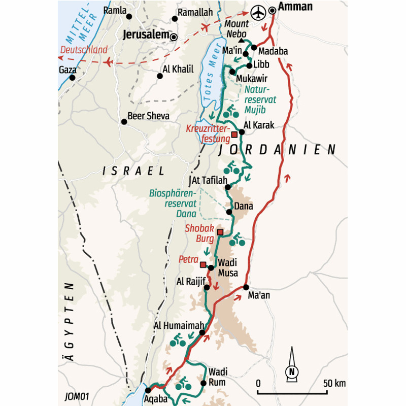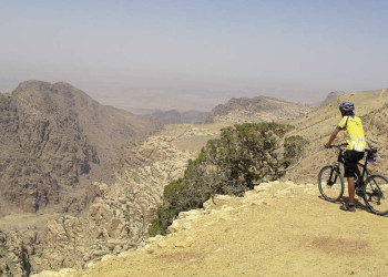 MTB Reise durch Wüstenlandschaften und zu kulturellen GlanzlichternWüstenlandschaften und kulturelle Glanzlichter Jordaniens auf dem Bike erleben: Vom heiligen Berg Nebo aus geht es zum Toten Meer, 400 m unter dem Meeresspiegel und gleichzeitig tiefster Punkt der Erde. Auf Pisten radeln wir durch den längsten Canyon des Landes zum Dana-Plateau. Den nächsten Höhepunkt bildet die 2000 Jahre alte Felsenstadt Petra mit ihren gewaltigen rot leuchtenden Tempelanlagen, eines der größten von Mensch und Natur gleichermaßen geschaffenen Wunder. Durch großartige Wüstenlandschaften geht es weiter zum Wadi Rum, einem zeitlosen Ort, von dem schon Lawrence von Arabien sagte: "Das Abendrot hüllt die gewaltigen Felsen und Schluchten in ein purpurnes Feuer". Eine Nacht im Beduinen-Camp unter dem endlosen Sternenhimmel bleibt unvergessen. Zum Abschluss der Tour lockt ein Bad im Roten Meer bei Akaba und ein kühler Drink am Strand bevor es zurück in die Zivilisation geht. Eine Biketour, die alle Höhepunkte der jahrtausendealten Kultur und überwältigenden Naturlandschaften Jordaniens vereint.