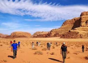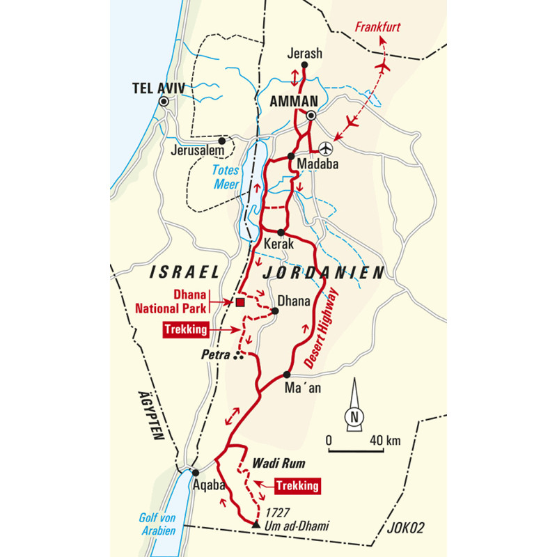 Trekkingreise: Entlang des Jordan Trails nach Petra und UNESCO-Welterbe Wadi RumDie Sonne funkelt im roten Sand, der Wüstenwind flüstert leise Geschichten und weiße Salzkristalle kribbeln auf der nassen Haut. Bizarre Sandsteinberge umrahmen sanft geschwungene Dünen. Jordanien ist "großes Kino", welches als großartiges Schauspiel der Natur auf unserer Leinwand flimmert. Wir werden Teil dieses Drehbuches, wandern durch weite Wadis, bewundern hängende Gärten und picknicken an sprudelnden Wasserfällen. Und die Drehpausen? Im Dhana Nationalpark wohnen wir in naturverbunden Lodges. Unser Trekking führt uns entlang des Jordan Trails durch eine wilde Felskulisse und wüstenhafte Täler. Plötzlich stehen wir vor einem der größten Tempel Petras - wir haben die rosarote Felsenstadt quasi durch den Hintereingang erreicht. Auf den Spuren von Lawrence von Arabien wandern wir durch die Wüste Wadi Rum. Felsmassive, wie die "Sieben Säulen der Erde" lassen beim Anblick unserer Fantasie freien Lauf. Wind und Sand haben architektonische Meisterwerke geschaffen und der Sternenhimmel sorgt für die richtige Beleuchtung. Aber auch Ausblicke in die unendliche Weite sind garantiert: Vom Jebel Um ad-Dhami bis nach Saudi Arabien und vom Berg Nebo ins "Gelobte Land". Wir genießen orientalische Gastfreundschaft und tauchen ein in die Welt der Beduinen – arabische Köstlichkeiten inklusive. Und am Ende noch eine Packung Wellness unter dem Meeresspiegel am Toten Meer und unser persönlicher Jordanien-Film wird zum Hit.