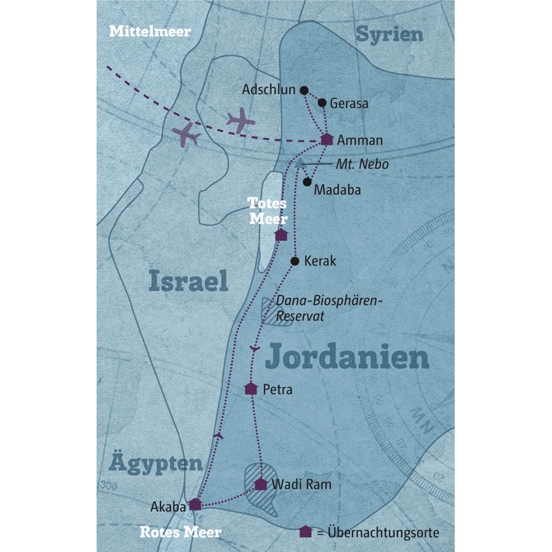 Die Idee dieser Reise: das facettenreiche Königreich Jordanien entdecken. Lassen Sie sich von einem einheimischen Fahrer chauffieren. Der Routenvorschlag unserer Länderexpertin verschafft Ihnen in nur acht Tagen einen guten Überblick über die Highlights des Landes. Wie die Menschen vor 2000 Jahren gelebt haben? Die gut erhaltenen römischen Ruinen in GERASA verraten es Ihnen. In MADABA werfen Sie einen Blick auf eine Landkarte aus Mosaiksteinchen, die älteste kartografische Darstellung des Heiligen Landes. Wer nach PETRA will, muss durch den Siq – an manchen Stellen passt kaum eine Pferdekutsche durch, so eng ist die rund einen Kilometer lange Schlucht. An ihrem Ende taucht das über 2000 Jahre alte Schatzhaus des Pharaos auf, in Wahrheit übrigens ein Mausoleum. Lawrence von Arabien bezeichnete es einmal als den "herrlichsten Ort der Welt" – wie recht er hat!Apropos Lawrence von Arabien: Folgen Sie seinen Spuren in die Wüste WADI RAM. Während er auf einem Kamel unterwegs war, fahren Sie im Jeep – auch das ist Abenteuer pur. Zwischen Sanddünen in allen Rotschattierungen und bizarren Felsen liegt ihr Wüstencamp. Die Beduinen bereiten Hühnchen, Fladenbrot und Hummus für Sie zu, die typische Kichererbsenpaste. Mein Tipp: Einfach hinsetzen und genießen – nicht nur das köstliche Wüstendinner, sondern auch die Nacht. Einen solchen Sternenhimmel sehen Sie nicht alle Tage!