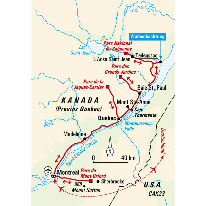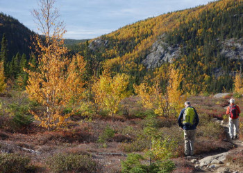 Wanderreise entlang der Ostküste von Montréal bis QuébecIm Herbst zeigen sich die ausgedehnten Wälder der Provinz Québec von ihrer schönsten Seite. Ein ganzer Landstrich begeistert durch seine Farbenpracht. Dunkelgrüne Tannen bilden einen stimmungsvollen Hintergrund für das leuchtende Rot der Ahornbäume und die goldgelben Blätter der Birken. Schwarzbären und Elchen bietet der Wald jetzt Nahrung in Hülle und Fülle. Auf bekannten sowie unbekannten Wegen abseits der gängigen Routen erwandern wir die Nationalparks Ostkanadas. Unzählige Seen und Flüsse durchziehen die Landschaft, vor allem der mächtige Sankt-Lorenz-Strom prägt die Region. Er verbindet die großen Seen mit dem Atlantik und wird an seiner Mündung so breit, dass der Eindruck entsteht, bereits am Meer zu stehen – besonders wenn Blauwale, Schwertwale und weiße Belugawale an uns vorbeiziehen. In der krill- und planktonreichen Fjord-Mündung bei Tadoussac stärken sich die friedlichen Meeressäuger und zeigen ihre mächtige Schwanzflosse, bevor sie wieder in die Tiefen des Stroms abtauchen. Bei der Wanderung am Cap Tourmente treffen wir die Schneegänse auf ihrem Weg ins Winterdomizil. Die französische Gourmetküche verwöhnt uns während der Reise – bei einer Weinprobe, einer Cidre-Verkostung oder in einem der exzellenten Restaurants in Québec. Hobbyfotografen und Natur-liebende Wanderer werden von dieser Reise begeistert sein – lassen Sie sich überraschen von unseren Geheimtipps und genießen Sie den Farbrausch des hiesigen weltberühmten Altweibersommers.