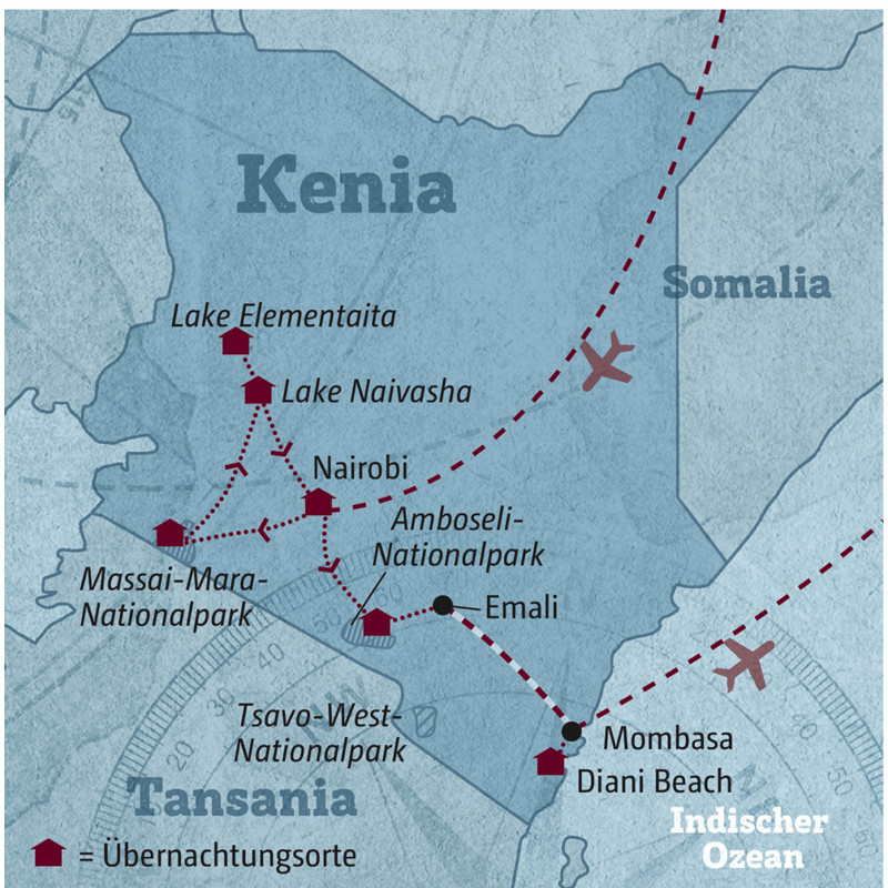 Die Idee dieser Reise: die berühmtesten Nationalparks Kenias – Massai Mara, Lake Nakuru und Amboseli – mit den Traumstränden Ostafrikas kombinieren. Stummelaffen in den Baumwipfeln, eine Hyäne, die hysterisch kichert, oder vorbeiziehende Zebraherden – nicht nur die BIG FIVE begeistern mich in der MASSAI MARA. Weiter zum LAKE NAKURU. Bis zu zwei Millionen Flamingos können sich hier tummeln und den See unter rosa Farbtupfern verschwinden lassen. Ihrer Leibspeise – Krebsen und Algen – verdanken sie das herrlich rosafarbene Gefieder. Im AMBOSELI-NATIONALPARK sind die Elefanten die unbestrittenen Stars. Das schönste Fotomotiv auf dieser Reise: eine Elefantenherde vor der Kulisse des schneebedeckten Kilimandscharo. Weiter geht es entspannt mit dem Zug nach Mombasa, wo Sie Ihren Urlaub am DIANI BEACH ausklingen lassen.