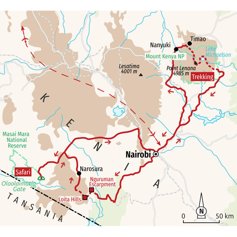 Trekkingreise mit Überschreitung des Mount Kenya-Massivs, Trekking am großen Grabenbruch und Safari in der Masai Mara"Das schönste Trekking Afrikas" – eine kühne Aussage angesichts der unzähligen Traumrouten des Kontinents. Doch der Mount Kenya verdient genau diesen Titel: Er steht oft im Schatten seines berühmten Nachbarn im Süden, bietet dabei aber mehr landschaftliche Vielfalt und Abwechslung – und ist damit ein echter Geheimtipp für alle, die das Besondere suchen. Unser Trekking beginnt auf der Timau-Route und führt uns durch immergrüne Wälder voller duftender Zedern und uralter Steineiben, vorbei an Bambushainen, in denen wir den Spuren wilder Tiere folgen, hinauf in den nebligen Regenwald mit moosbehangenen Kosobäumen, mannshohen Farnen und wilden Orchideen. Auf rund 3.300 m betreten wir die beeindruckenden Moor- und Heidelandschaften, in denen endemische Riesenlobelien und die berühmten Senezien vor den schroffen, teils schneebedeckten Gipfeln wachsen. Unser Ziel ist der Lenana Point (4.985 m) – von dem sich das Bergmassiv in seiner ganzen Schönheit eröffnet. Hier genießen wir die spektakulären Panoramen und die klare Hochgebirgsluft, bevor wir über den Lake Michaelson (3.950 m) ins Tal absteigen. Nach der Bergwelt erwartet uns das nächste Highlight: die Überquerung des Afrikanischen Grabenbruchs am Nguruman Escarpment, gemeinsam mit dort heimischen Massai. Eine eindrucksvolle Begegnung von Natur und Kultur, die tiefe Einblicke in das Leben am Rift Valley ermöglicht und uns über die unberührte Schönheit der angrenzenden Loita Hills (2.200 m) führt. Tiersichtungen höchst wahrscheinlich! Zum Abschluss führt uns die Reise in die Masai Mara – das tierreichste Reservat Kenias. Während der großen Migration erleben wir hier eines der größten Naturschauspiele der Erde: unzählige Gnus, Zebras, Gazellen und Antilopen ziehen über die Ebenen, gefolgt von Löwen, Geparden und Leoparden. Ein Finale, das diese Reise unvergesslich macht.