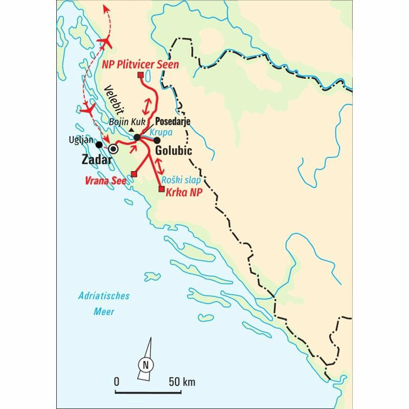 Standort-Wanderreise zu den schönsten Nationalparks rund um ZadarDie warme Luft duftet nach Pinien. Möwen überlassen sich spielend der Thermik und ihr Krächzen hallt bis weit hinter die Küstenpfade. Tausend Meter tiefer liegen unzählige kleine Inseln wie große Kieselsteine in der tiefblauen Adria, die Segelboote und Yachten dazwischen wirken wie bunte Spielzeugboote. Am Rande der Küstenwege wachsen pinke Orchideen und sorgen für einen knalligen Kontrast zum Grün der Natur, genau wie der knallgelbe Ginster, der überall zu wuchern scheint. Doch es geht sogar noch grüner: Rund um die Plitvicer Seen schimmert sogar das Wasser in verschiedenen Grüntönen - kein Wunder, dass auch Winnetou von der Region begeistert war. Wir steigen auf den Bojin Kuk und werden mit einer herrlichen Küsten-Aussicht belohnt. Wir streifen durch die Weinberge und Olivenbaum-Plantagen auf der Insel Ugljan, erkunden die Schlucht des türkis leuchtenden Krupa-Flusses und folgen den plätschernden Flusstälern im Krka Nationalpark. Wir wandern entlang des Vrana-Sees durch das ornithologische Reservat und lauschen dem Gesang der Wasservögel. Auf unseren Wegen bestaunen wir die unberührte Natur, zum Abendessen genießen wir kroatische Köstlichkeiten und auch das Baden im Meer lassen wir nicht aus. Für eine Prise Kultur ist ebenfalls gesorgt: Auf der Insel Visovac lernen wir die Geschichte der orthodoxen und katholischen Klöster kennen und in Zadar die Überbleibsel der Römer und ganz viel moderne Neuzeit. Eine Reise mit vielen Ausblicken und intensiven Einblicken.