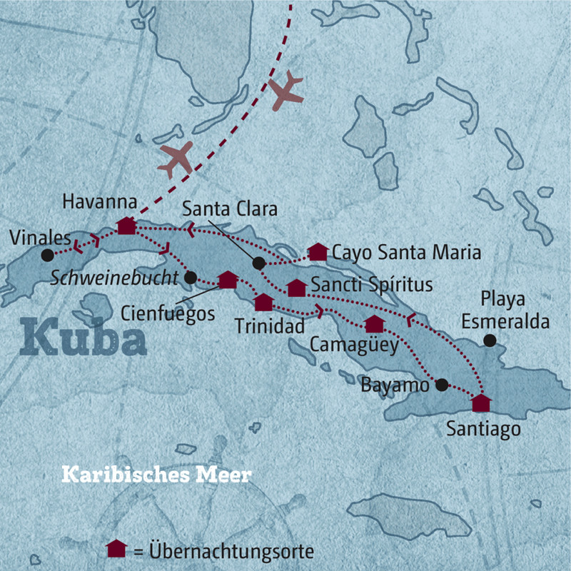 Die Idee dieser umfassenden Reise: das Land, seine Leute und historischen Schauplätze kennenlernen. Dafür ist der Routenvorschlag unserer Länderexpertin perfekt geeignet - im Privatwagen mit Scout von West nach Ost, von Havanna bis Santiago. Cruisen Sie im Chevy durch HAVANNA, vorbei an morbiden Kolonialbauten und den Anglern am Malecón. Im Tal von VINALES hängt der Duft der Mariposa in der Luft. Ihre weißen Blütenblätter benutzten die Frauen zu Zeiten der Revolution gegen die Spanier, um darauf heimliche Botschaften an ihre Männer zu notieren. In SANTIAGO, der zweitgrößten Stadt der Insel, sollten Sie über den Friedhof Santa Ifigenia spazieren. Das meistbesuchte Grab: ein riesiger Findling mit der schlichten Aufschrift "Fidel" - das Grab von Fidel Castro. Wohin Sie am Abend am besten gehen? Ich schlage vor, immer den Ohren nach. Denn die Kubaner tanzen nicht nur in den Bars, sondern auch in Innenhöfen und fast an jeder Straßenecke.
