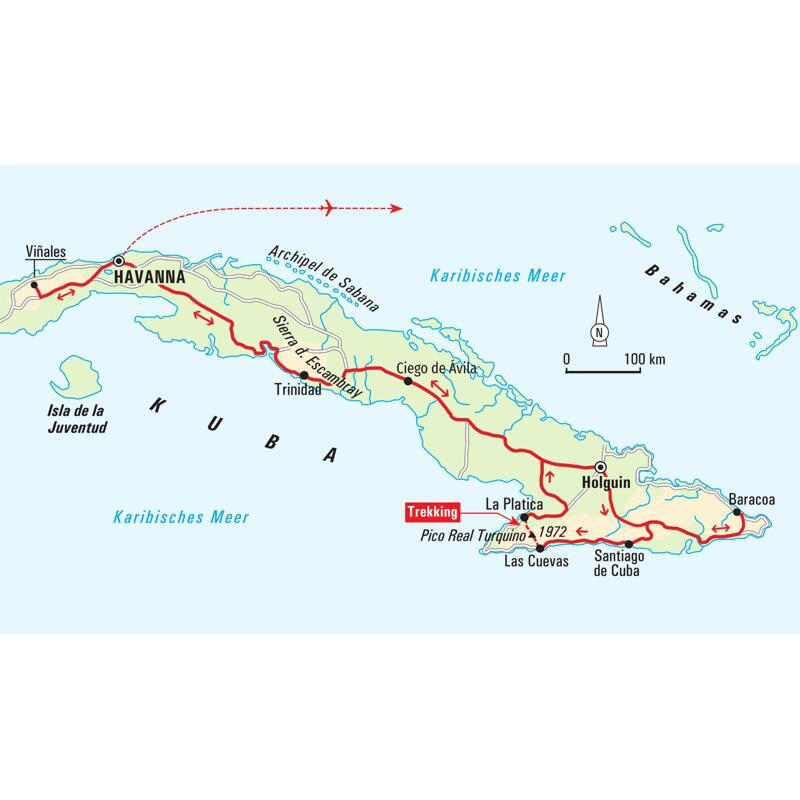 Alterntivprogramm zum Trekking: Wanderreise ab Havanna über die Karibikinsel "Bergsteigen verbrüdert Menschen" - schrieb José Martí, kubanischer Nationalheld und Poet in seinem Kampagnentagebuch. Für die Kubaner ist der Pico Turquino das Dach ihres Vaterlandes, das Sinnbild für Erfolg des menschlichen Lebens. Wir besteigen bei dieser Alternative zum Trekking den Pico Turquino zwar nicht, sind aber dennoch in der Sierra Maestra und wandern gemeinsam mit der restlichen Gruppe das letzte Stück bis zur Comandancia de la Plata, dem Hauptquartier der damaligen Revolutionsführer. Bei unseren Begegnungen mit den Kubanern in kleinen Dörfern erfahren wir viel über die alten Zeiten. Wir erwandern verborgene Winkel Kubas, in denen das Leben in einem langsameren Rhythmus läuft und die Natur die Hauptrolle spielt. Im Viñales-Tal erfahren wir aus erster Hand von einem Tabakbauern wie man eine kubanische Zigarre dreht, während seine Frau uns frisch geernteten Kaffee serviert. Gelegenheit zum Gedankenaustausch bietet sich auch bei dem Besuch einer Künstlerfamilie in Santiago de Cuba und einem gemeinnützigen Projekt auf dem Weg nach Viñales. Die kubanische Lebensfreude ist eng verbunden mit der Musik - Salsa bestimmt den Alltag der Kubaner. Wir genießen die Atmosphäre der kolonialen Städte mit ihren bunten Häusern, das Treiben in den kopfsteingepflasterten Straßen und den legendären amerikanischen Straßenkreuzern. Schweren Herzens verlässt man die Isla Bella, doch unvergessen bleiben die Eindrücke dieser einzigartigen Insel.