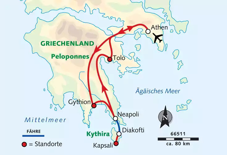 Kythira ist ein Paradies voller wilder Natur, einsamer Strände und göttlicher Stille. An ihre Gestade hat Paris einst die schöne Helena entführt. Abseits der Touristenströme haben die Einwohner der Insel das alte System der Verbindungwege wieder zum Leben erweckt und pflegen die romantischen Saumpfade zwischen Dörfern, Stränden und versteckten Sehenswürdigkeiten. Ein Paradies für Wanderer. Auf dem Weg nach Kythira entdecken wir die Mani, die sagenumwobene Halbinsel am südlichen Ende der Peloponnes mit ihrer dramatischen Geschichte und den berühmten Wehrtürmen. Griechenland, wie es nur wenige kennen. Nach einem Besuch von Mykene und Epidauros klingt die Reise in Nafplio fürstlich aus: Wir tauchen in Lichterglanz und klassizistisches Ambiente. Die Gassen und Plätze der königlichen Stadt verzaubern uns vom ersten Augenblick.