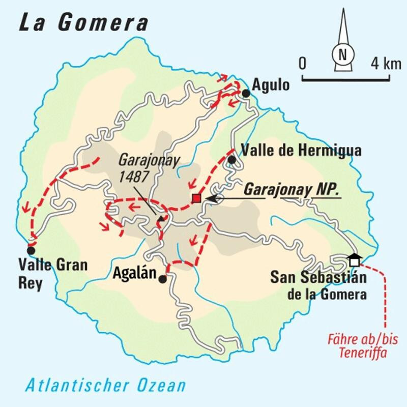 Standort-Wanderreise durch die üppige Vegetation und zerklüftete Gebirgslandschaft der KanareninselSchluchten, die ins Meer hinabstürzen, enge Täler, die ihrer Vielzahl an Palmen fast schon tropisch wirken und überall beherrscht sattes Grün die Kulisse: Die Natur mit ihrem vulkanischen Ursprung hat eine beeindruckende Insel der Kontraste geschaffen. Wolfsmilchgewächse, Drachenbäume und Palmenhaine im Süden, dschungelartiger Wald im Norden – auf La Gomera wachsen Pflanzenarten, die im Rest der Welt schon fast verschwunden sind. Wir erkunden den immergrünen Nationalpark Garajonay, der sich mit seinen bis zu zwei Meter hohen Farnen, den mit Moos bewachsenen knorrigen Bäumen und den leise murmelnden Bächen wie ein Urwald aus dem Märchenbuch präsentiert. Auf dem Weg zur Bergspitze des Garajonay treiben Gnome und Elfen ihren Schabernack - zumindest scheint es so, wenn die knorrigen Äste und Wurzeln beim Wandern nach unseren Füßen greifen und die plätschernden Wasserfälle zu uns flüstern. Am höchsten Punkt der Insel angekommen, werden wir mit einer traumhaften Aussicht belohnt – bei klarer Sicht können wir sogar den Vulkan Teide auf der Nachbarinsel Teneriffa entdecken!