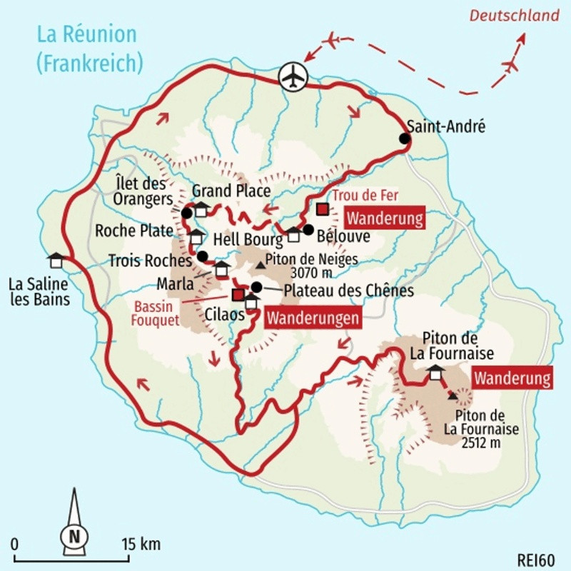 Trekking- und Wanderreise durch den Mafate-Talkessel und zum Vulkan Piton de la Fournaise mit anschließendem BadeaufenthaltDort, wo dunkle, rauchende Lavafelder nahtlos auf ockerfarbene Mondlandschaften treffen, wechseln sich tropische Wälder mit üppigem Grün, paradiesische Strände und duftende Vanillefelder ab. Zwischen diesen beeindruckenden Szenerien ziehen sich dschungelartige Täler voller Bambus, Tamarinden, hoher Farnen und exotischer Orchideen.La Réunion - die französische Insel im Indischen Ozean bietet seinen Besuchern eine große Vielfalt auf kleinem Raum . Unsere Selfguided-Reise führt Sie durch den abgeschiedenen Mafate-Talkessel, wo die Zeit stillzustehen scheint, und hinauf zum Krater des mächtigen Piton de la Fournaise. Von hier aus eröffnet sich ein atemberaubender Blick, und schon bald können Sie das glitzernde Meer erspähen, das den krönenden Abschluss Ihrer Reise bildet. Tropische Wälder, paradiesische Strände und der Duft von Vanille – so exotisch kann Europa sein.