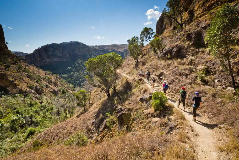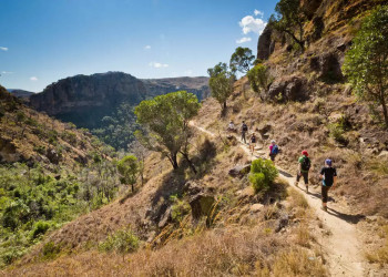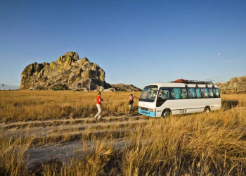 9. - 10. Tag: Isalo-NationalparkDurch eine Savannenlandschaft gelangen wir nach Ranohira. Inmitten der Weite taucht das Bergmassiv des Isalo-Nationalparks auf. Unsere Wanderung führt uns zu seltenen Pflanzen, Lemuren und Reptilien. GZ ca. 6 Stunden. 2 Hotelübernachtungen in Ranohira. 250 km. (2 x F, 2 x A)