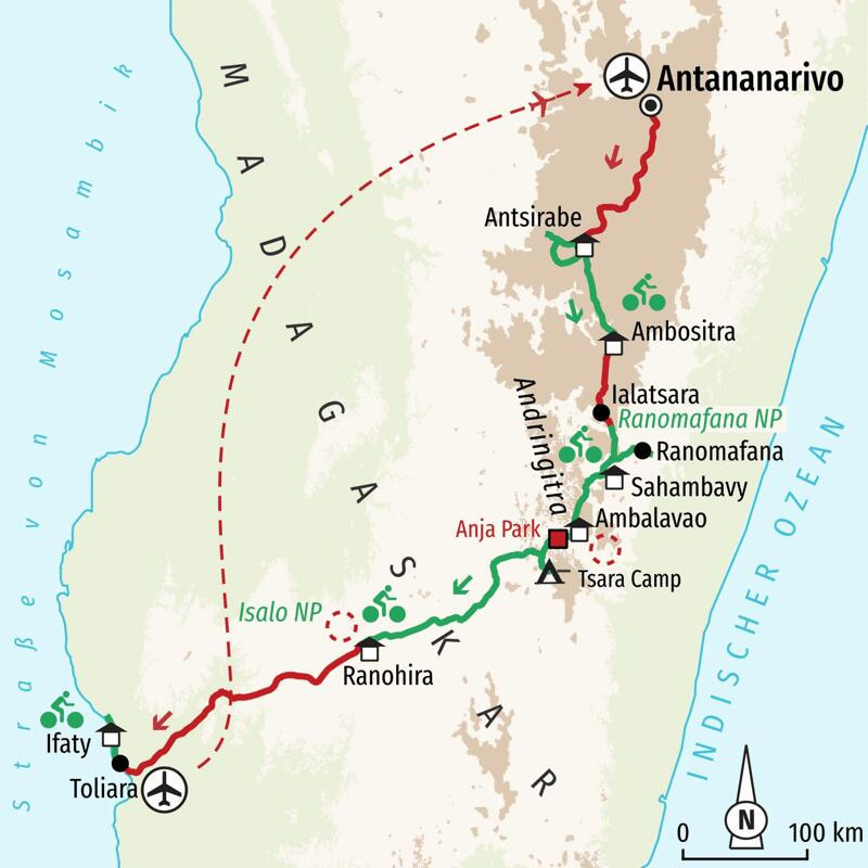 MTB Reise durchs Land der Lemuren zum Indischen OzeanAuf dieser Radreise durch den Inselstaat Madagaskar tauchen wir in eine exotische Bilderbuchlandschaft ein: Majestätische Baobabs thronen in der Savanne, Zebu-Rinder grasen vor bizarren Felsformationen im Hochland, aus den Wäldern weht der Duft von Eukalyptus und in den Nationalparks huschen possierliche Lemuren mit ihren Kulleraugen durch den Regenwald. Allen voran die Kattas mit ihren langen, schwarz-weiß geringelten Schwänzen. Zu den Schätzen Madagaskars gehört auch die ungeheure Vielfalt der Fauna und Flora, die nur hier beheimatet ist: Orchideen, Farne, Lianen und Vanille, dazwischen farbenfrohe Chamäleons und eine einzigartige, seltene Vogelwelt – die Natur läuft hier zu ihrer Höchstform auf. Wir radeln auf technisch leichten Asphaltstraßen und Sandpisten durch rote Savanne, vorbei an Wasserfällen, Schluchten und Baobab-Wäldern. Unterwegs in den kleinen traditionellen Dörfern, in denen die Zeit stehen geblieben scheint, plaudern wir mit den gastfreundlichen Madagassen. Als krönender Abschluss locken die Palmenstrände am Indischen Ozean und das Korallenriff zu einer Unterwasser-Pirsch.Fr, 20. März 2026–Di, 07. April 2026 - Mindestteilnehmerzahl erreichtFr, 27. März 2026–Di, 14. April 2026 - Mindestteilnehmerzahl erreichtMo, 20. April 2026–Fr, 08. Mai 2026 - Mindestteilnehmerzahl erreichtFr, 08. Mai 2026–Di, 26. Mai 2026 - Mindestteilnehmerzahl erreichtFr, 12. Juni 2026–Di, 30. Juni 2026 - Mindestteilnehmerzahl erreicht