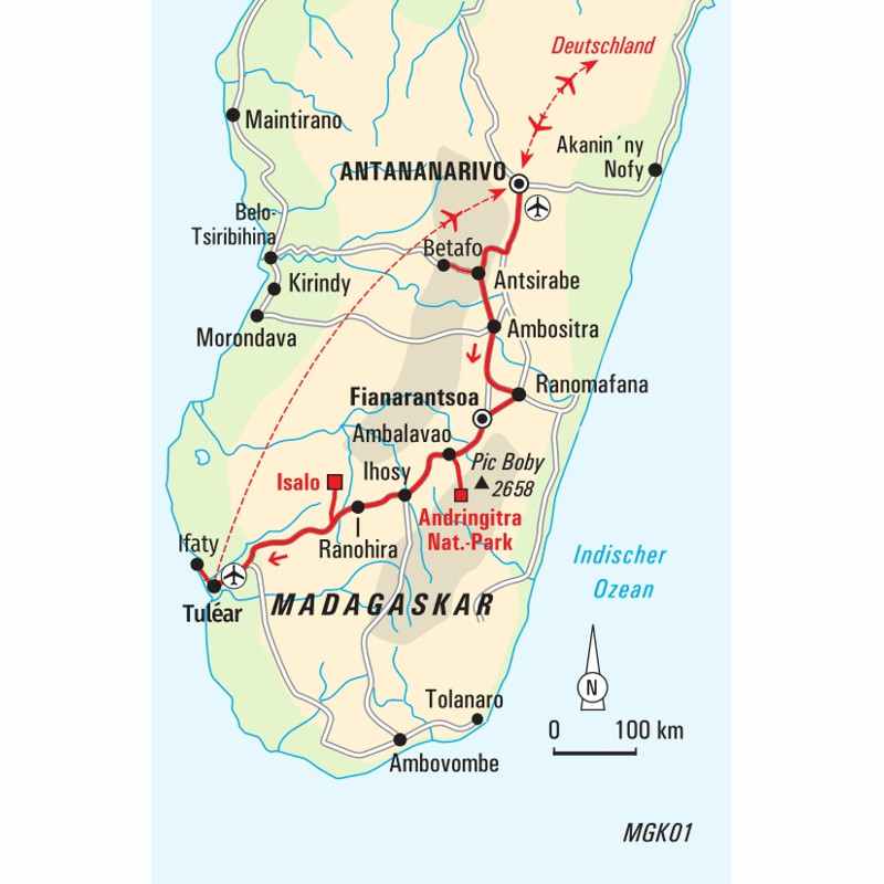 Trekkingreise durch Wildreservate, Nationalparks und Gebirge im Süden mit Überschreitung des Andringitra-MassivsLandschaftliche Höhepunkte unserer Reise sind die Überschreitung des Andringitra-Gebirges mit seinen eindrucksvollen Felsformationen aus Granitstein sowie unsere Wanderungen im Isalo-Nationalpark. Zwischen Felsgrotten und tiefen Schluchten führt unser Weg ins Tal der Affen. Die Kattas hangeln sich morgens an den steilen Wänden hinunter, um zu trinken. An der Ostküste besuchen wir Reservate im Regenwald und können dort neben Lemuren und Makis eine faszinierende Pflanzenvielfalt entdecken – Farne, Lianen, Vanille und Kannenpflanzen sind nur einige der dort zu entdeckenden Flora. Genauso vielfältig sind die Einwohner dieses Landes. Madagaskar wurde vom Westen her von afrikanischen, ostwärts von asiatischen Völkern besiedelt. Wir wandern in der Betafo-Region über kleine Dörfer und treffen unterwegs Bauern zwischen Reisterrassen und Ackerland. Zum Abschluss lassen wir die Reise an den Stränden des Indischen Ozeans im Fischerdorf Ifaty im Schatten der Palmen entspannt ausklingen.