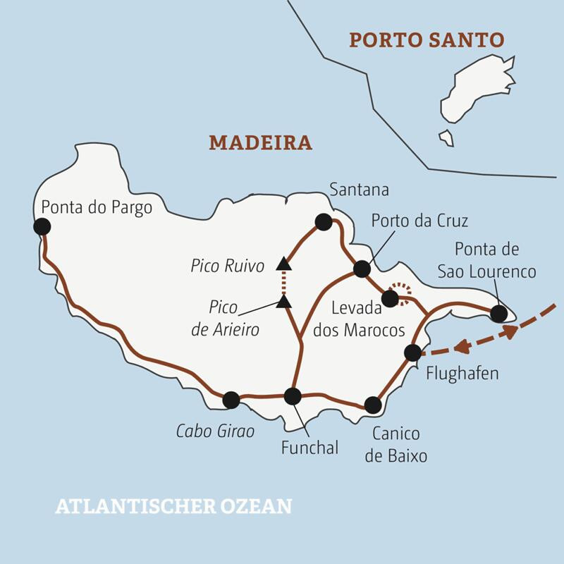 Für die einen ist Madeira die blumenreiche Überwinterungsinsel nach einem langen Arbeitsleben - für uns ist das schroffe Eiland dagegen ein echtes Outdoor-Paradies! Dramatische Vulkanlandschaften, bizarre Felsformationen und dichte Wälder erwarten uns: Trekkingschuhe und Daypack ins Gepäck, schon geht's los. Wir erklimmen den höchsten Berg der Insel, wandern an der wilden Steilküste entlang und folgen den berühmten Levadas, die das üppige Grün der Insel mit Wasser versorgen. Wer mag, saust im Korbschlitten durch die Inselhauptstadt Funchal oder powert sich bei einer Kajaktour aus. Mehr als verdient ist dann der zweite Teil der Reise: relaxte Sonnentage im Strandhotel – und wer sagt schon "nao" zu einem Glas Madeira-Wein?