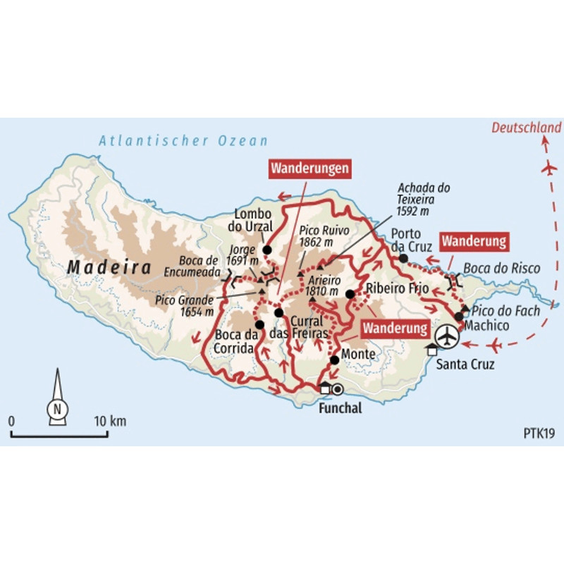 Wanderreise entlang alter Verbindungswege durch die zentrale Gebirgskette der AtlantikinselGeisterhaft ziehen die Wolkenschwaden zu unseren Füßen durch das mächtige Zentralmassiv, bis die umliegenden Bergspitzen wieder aus ihnen hervorbrechen. Jaulend weht uns der Wind um die Ohren und bläst die Wolken weiter. Unter uns werden die schroffen, steil abfallenden Hänge der Gebirgslandschaft wieder sichtbar. Madeiras Bergwelt umringt uns von allen Seiten und die Kulisse zieht uns in ihren Bann! Wir wandern entlang der Steilküste nach Porto da Cruz, besteigen die höchsten Gipfel der Insel und überschreiten auf einem langen, spannenden Pfad den Hauptkamm der Insel bis zum Encumeada-Pass. Doch wir wollen ganz tief eintauchen in das Zentralmassiv und trekken auch auf den weniger bekannten, uralten Verbindungspfaden der Insel, die einst den Norden und Süden Madeiras verbanden. In den abgeschiedenen fruchtbaren Tälern, auf den einsamen Hochebenen und in den dichten Lorbeer- und Eukalyptuswäldern genießen wir die Stille der Natur abseits der Touristenströme. Die kulinarische Vielfalt Madeiras lassen wir uns aber nicht entgehen - wir besuchen die Zuckerrohrfabrik Engenhos do Norte, schlemmen Espetada-Spieße mitten in den Bergen und genießen frischen Fisch und ein Glas Madeirawein in den Gässchen von Funchal. Stück für Stück durchqueren wir das Zentralmassiv der Insel und lernen dabei Landschaft, Leute und Leben Madeiras intensiv kennen.