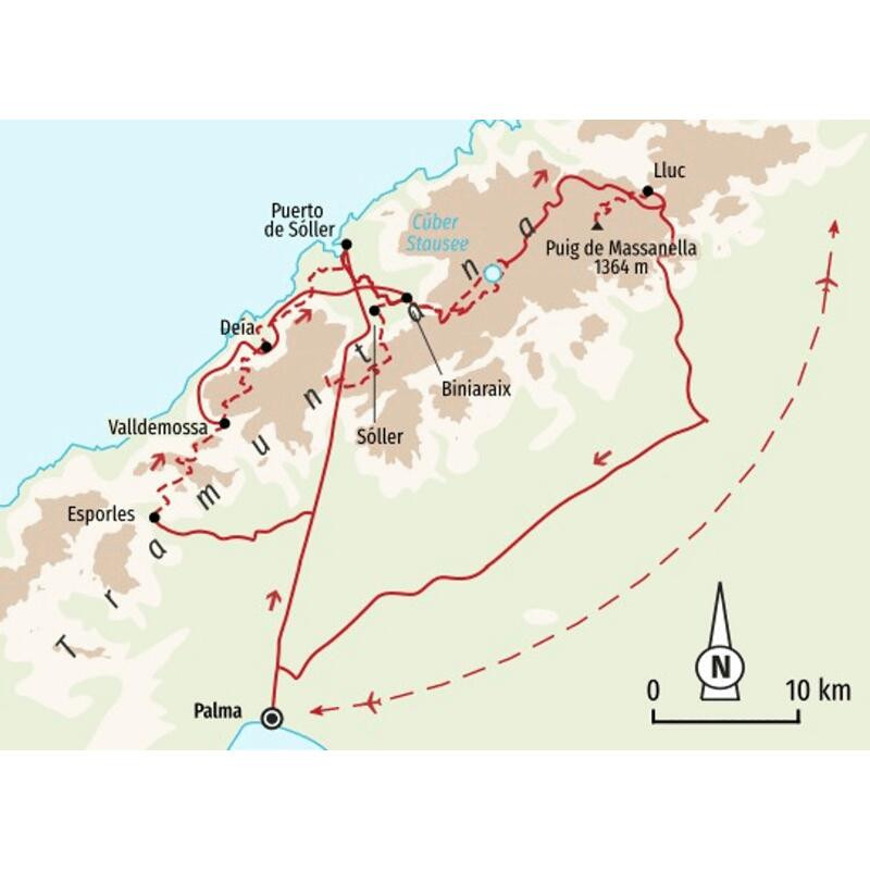 Wanderreise von Puerto de Sóller bis Lluc auf Abschnitten des Fernwanderweges GR221Eine leichte Brise weht - es duftet nach Kiefern und Zitrusfrüchten. Der Blick schweift über das Meer und die skurrilen Klippen der Steilküste. Ein paar Ziegen kreuzen flüchtig den Weg und verschwinden wieder im Gebüsch. Noch einmal tief durchatmen und schon setzen wir unsere Wanderung fort, denn auf Mallorca gibt es so viel zu entdecken! Wir wandern auf den malerischen Pflasterwegen in der Schlucht von Biniaraix und beobachten vom Gipfel des Puig Massanella aus das Tauziehen zwischen Sonne und Wolken über dem Puig Mayor. Stück für Stück wandern wir durch die Serra de Tramuntana und einige ihrer schönsten Ortschaften. Wir folgen Teilen des Fernwanderweges GR221 und genießen die wechselnde Vegetation zwischen der rauen Küste, lichten Kiefern- und Steineichenwäldern, knorrigen Olivenbäumen und der kargen Karstlandschaft der Gipfel. Mediterrane Pflanzen sind unsere stetigen Begleiter: Steineichen, Erdbeerbäume, Strauchheide, Zwergpalmen und Mastixsträucher zeigen uns den Weg zu den Gipfeln des Tramuntana-Gebirges. Nach unserer Zeit im Küstenort Puerto de Sóller ist das historische Kloster Lluc unsere letzte Station nach unseren Wandererlebnissen zuvor. Dort lassen wir uns von der einzigartigen Atmosphäre des Klosters einnehmen, während wir die gemeisterten Wanderungen und die landschaftlichen Eindrücke Revue passieren lassen. So lässt sich Mallorca erleben!