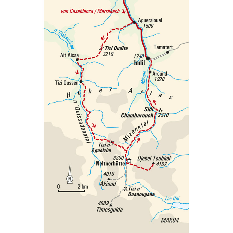 Durch stille Nebentäler - Trekking zum Djebel Toubkal (4.167 m) und Marrakech-FlairAuf zum höchsten Gipfel Nordafrikas! Hochweiden, tiefe Schluchten und die gezackten Kämme mehrerer 4.000er prägen den Toubkal-Nationalpark. Unsere Route führt uns durch ein Nebental. Wir starten in einem kleinen Berberdorf, dessen Lehmhäuser sonnenbestrahlt am Hang kleben. Wenige Tage später, mittlerweile gut an die Höhe angepasst, starten wir frühmorgens im Licht der Stirnlampen die Gipfeletappe. Kurze Zeit später eröffnet sich uns im Morgenlicht die Fernsicht auf die Gipfel des Hohen Atlas: Das ist echtes Trekkingerlebnis! Die knapp 1.000 Höhenmeter vom Basislager zum Gipfel überwinden wir in ca. 4 Stunden. Nach der anstrengenden, aber technisch einfachen Besteigung stehen wir auf dem Djebel Toubkal, dem "Berg der Berge" in der Sprache der Berber. Bei der Gipfelrast bietet sich ein überwältigendes Panorama hinunter in die südmarokkanische Wüstenebene und auf die 4.000er-Kämme des Hohen Atlas um uns herum. Nach dem Abstieg genießen wir nochmals das Berg-Panorama, diesmal allerdings gemütlich und weich sitzend bei einem duftenden Minztee von unserer Dach-Terrasse in Aremd aus. Als Kontrast zur Bergwelt erkunden wir die schönsten Winkel der Königsstadt Marrakech. Bunte Mosaik-Kacheln zieren Paläste und alte Karawansereien. Mit einem echten Marrakchi, dem örtlichen Stadtführer, durchstreifen wir die rosa-roten Gassen der Altstadt. Am letzten Tag der Reise haben wir noch genügend Zeit für eigene Erkundungen und einen Einkaufsbummel durch die verwinkelte Medina.