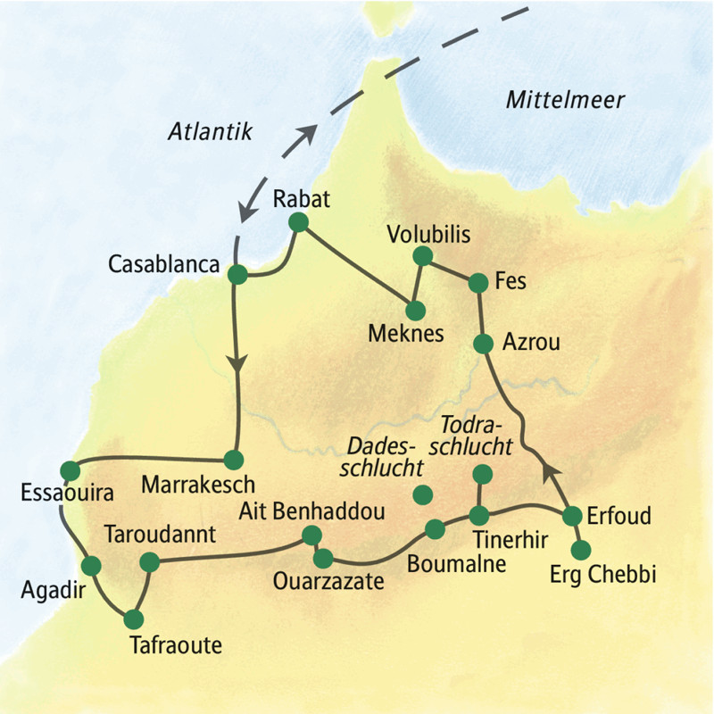 Märchenhafte Königsstädte voller Orientzauber, Schluchten und Oasen des Hohen Atlas, die Sanddünen der Sahara und die Atlantikschönheit Essaouira – auf unserer ausführlichsten Reise durch das nordafrikanische Königreich vereinen sich Marokkos Facetten zum Gesamtkunstwerk. Alle Sinne kommen zum Einsatz bei Couscous und Tajine, auf Schnuppertouren in den Souks, beim Sonnenuntergang in der Wüste und wenn das Konzert der Muezzins die ländliche Stille durchbricht. Im Gespräch mit Frauen einer Arganöl-Kooperative oder beim Tee im Berberdorf lernen wir auch die Lebenswelt der Marokkanerinnen und Marokkaner kennen.