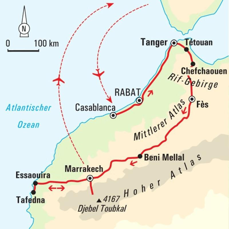 Wanderreise von Tanger über den Hohen Atlas und Marrakech an die AtlantikküsteGeschäftige Morgenstimmung liegt über der Medina von Tanger. Möwen flattern, der Dunst über der Straße von Gibraltar verzieht sich und gibt den Blick auf Andalusien frei. Guten Morgen Marokko! Kein Land liegt so nah und ist doch so vielfältig und anders. Im Rif-Gebirge im grünen Norden des Landes liegt das pittoreske Chefchaouen. Wir streifen durch blau getünchte Gassen und wandern in der umliegenden Bergwelt. In der Königsstadt Fès erleben wir das alte Marokko – vom bunten Warenangebot bis zu klappernden Eselshufen in der Altstadt. Zwischen den historischen Gebäuden und verwinkelten Gassen spüren wir den Puls der Stadt und die jahrhundertealte Kultur hautnah. Die lebhaften Souks laden zum Verweilen ein, während wir die handgefertigten Teppiche und kunstvollen Keramiken bewundern. Im Hohen Atlas wandern wir zwei Tage zu Füßen der höchsten Berge Nordafrikas. Die klare Bergluft und die atemberaubenden Aussichten machen jede Anstrengung mehr als wett. Danach geht es an den Atlantik nach Essaouira, wo um den Fang gefeilscht wird und die Brisen des Atlantiks wehen. Im Rhythmus der Brandung wandern wir an der Küste entlang. Wir wohnen in stilvoll renovierten Riads – Oasen der Ruhe inmitten der Altstädte, mit plätschernden Brunnen und orientalischen Ornamenten. So entfaltet Marokko auf unserer Reise seine ganze Vielfalt – zwischen lebendigen Medinas, majestätischen Bergen und dem Zauber des Atlantiks.