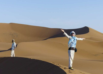Marokkanisches Kaleidoskop aus Medinas und dem Takt der weiten WüsteMarokkos Königsstädte zeigen den Zauber des Maghreb: prunkvoll dekorierte Paläste, mit Stuck verzierte Koranschulen und Karawansereien vergangener Tage. Wir schlendern über quirlige, farbenfrohe Basare, die unsere Sinne betören. Eselshufe klappern durch die engen Gassen der verwinkelten Altstadt, wir springen lieber aus dem Weg und machen den Händlern und ihren Tieren Platz. Handwerker in langen Gewändern klopfen riesige Kupferkessel. Wir besichtigen die römischen Ausgrabungen von Volubilis, die als bedeutendste römische Freilegungen Marokkos gelten. Durch schattige Zedernwälder queren wir die Ausläufer des Hohen Atlas, fahren vorbei an Palmenoasen und erreichen bei Merzouga die Ausläufer der Sahara. Beim viertägigen Wüstentrekking durchwandern wir ein weitgehend unberührtes, einsames Dünengebiet. Im Stil einer Karawane ziehen wir mit Lastkamelen durch dieses gelb-orange Dünenmeer. Südlich des Atlas-Gebirges zieren Türmchen und Berber-Symbole die traditionellen Kasbahs, aus Stampflehm gebaute Festungsanlagen. Über das Atlas-Gebirge windet sich die höchste Passstraße eindrucksvoll bis nach Marrakech. Das rosafarbene Labyrinth der Altstadt präsentiert sich als buntes Mosaik aus Waren, traditionellen Handwerksbetrieben und dem großen Marktplatz mit seinen Gauklern, Schaustellern und Schlangenbeschwörern. Bei einem süßen Minztee beobachten wir das lebendige Treiben, während die Sonne am Horizont untergeht.