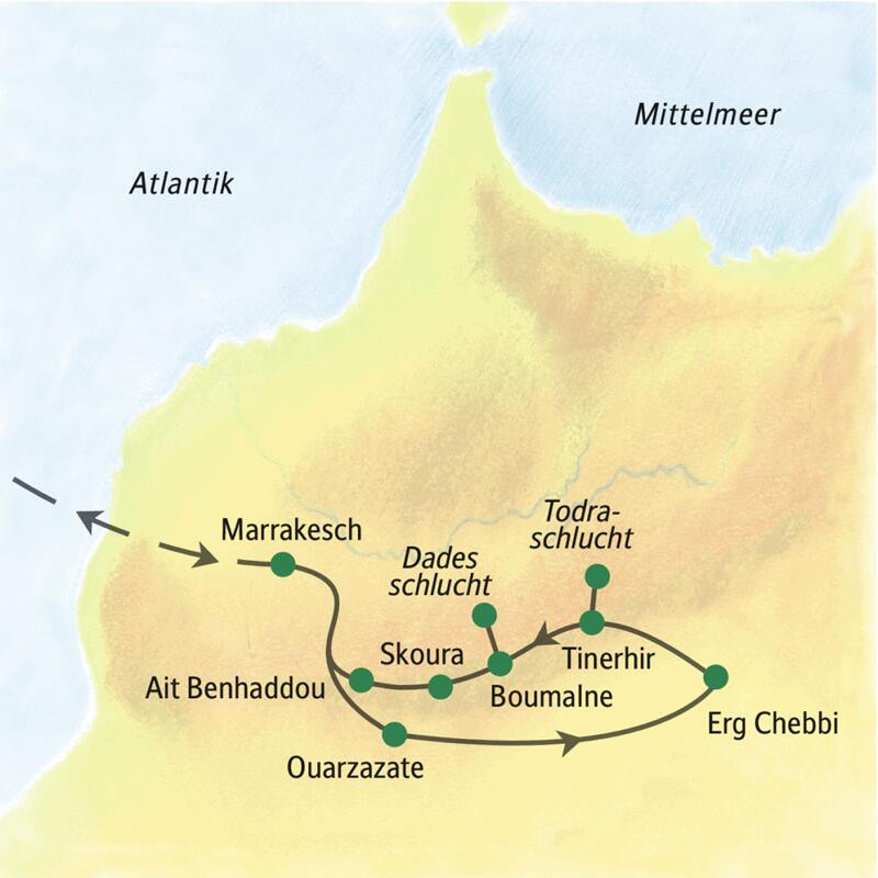 Tauchen Sie ein in eine andere Welt: Begegnen Sie dem Leben am Rand der Sahara, fahren Sie mit Jeeps zu riesigen Sanddünen und staunen Sie über wildromantische Schluchten. Und freuen Sie sich auf Marrakesch: Orient pur!