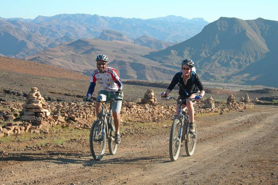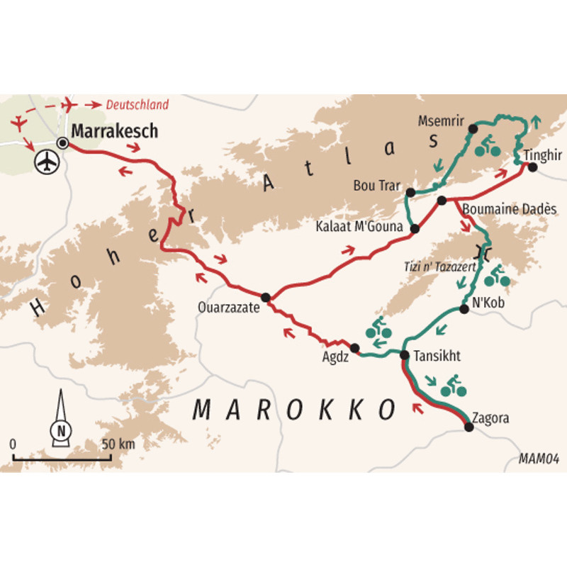 Von Marrakesch durch den hohen Atlas zu imposanten BergtälernVom Hohen Atlas im Norden bis zum Jebel Sarhro-Massiv im Süden durchqueren wir auf dem Bike faszinierende Wüstenlandschaften. Das Tal des Dades ist Teil der Straße der tausend Kasbahs und ihr reizvollster Abschnitt. Mit geometrischen Mustern verzierte Wehr- und Wohnburgen aus Lehm reihen sich hier aneinander wie Perlen auf einer Schnur. Das Sarhro-Massiv, zwischen den Flusstälern des Draa und des Dades, beeindruckt durch seine von tiefen Schluchten durchzogene zerklüftete Vulkanlandschaft. Mit dem Mountainbike erfahren wir das Wüstengebirge gemeinsam mit unseren Begleitern, den im Atlas-Gebirge beheimateten Berbern. Verwitterte, bizarre Felstürme und monumentale Tafelberge schillern im wechselnden Licht. Weit schweift der Blick zu ockerfarbenen Gebirgszügen, metallisch schimmernden Felswänden und in der Abendsonne leuchtenden Bergen! Abends duftet würziges Couscous, dazu frischer Pfefferminz-Tee. Zum Abschluss erleben wir die Altstadt von Marrakesch, das bunte orientalische Treiben in den Souks und auf den Plätzen mit ihren verlockenden Garküchen und Cafés – eine Welt wie aus 1001-Nacht.