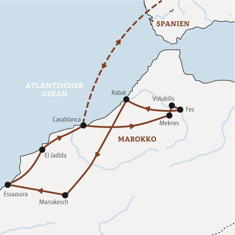 Marokko – Märchenwelt aus 1001 Nacht! Wir erleben Orient pur in den Souks von Fes und Marrakesch. Die Künstlerviertel von Rabat und der Küstenstadt Essaouira stehen genauso auf dem Programm wie Casablanca mit seiner riesigen, modernen Moschee. Und in Volubilis unternehmen wir eine spannende Zeitreise in die römische Vergangenheit.