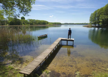 6. Tag: So zärtlich schlängelt sich der FlussAuf zum Mokre-See! Über eine Waldallee, die von hundert Jahre alten Eichen und Kiefern gesäumt ist, erreichen wir den See. Entlang des Seeufers gehen wir bis zum Wehr auf dem Krutinnen-Fluss (GZ: 3 Std., +/- 50 m). Dieser begleitet uns dann durch ein lichtes Wäldchen bis nach Krutyn, wo wir in Boote steigen. Wir lassen uns gemächlich staken. Herrlich – der Krutinnen-Fluss von seiner schönsten Seite.
