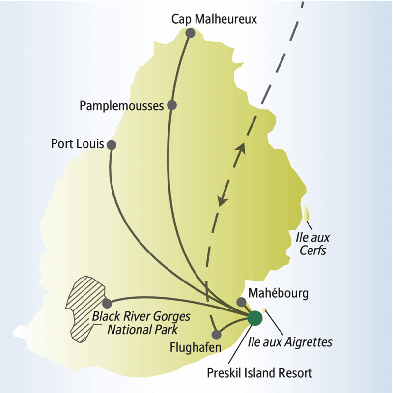 Hotel Preskil Island Resort ****Das Preskil Island Resort**** überzeugt mit seiner traumhaften Lage im Südosten der Insel. Nur wenige Kilometer von Mahébourg erstreckt sich die weitläufige Hotelanlage auf einer kleinen vorgelagerten Insel mit eigenem Strand. Vom Hotel mit seinen 214 Zimmer blicken Sie Richtung Sonnenaufgang und Ile aux Aigrettes. Die großzügigen Zimmer verfügen über Klimaanlage, Sat.-TV, kostenloses WLAN, Minibar, Safe, Kaffee-/Teezubereiter und Balkon oder Terrasse. Zur Anlage gehören drei Restaurants, zwei Bars und 2 Pools. Neben zahlreichen Wassersportaktivitäten (teilweise gegen Gebühr) stehen Ihnen Beachvolleyball, Tischtennis, ein Fitnessraum und Tennisplätze zur Verfügung. Entspannung finden Sie im hoteleigenen Spa (Anwendungen gegen Gebühr). Einzelzimmer sind Doppelzimmer zur Alleinbenutzung.