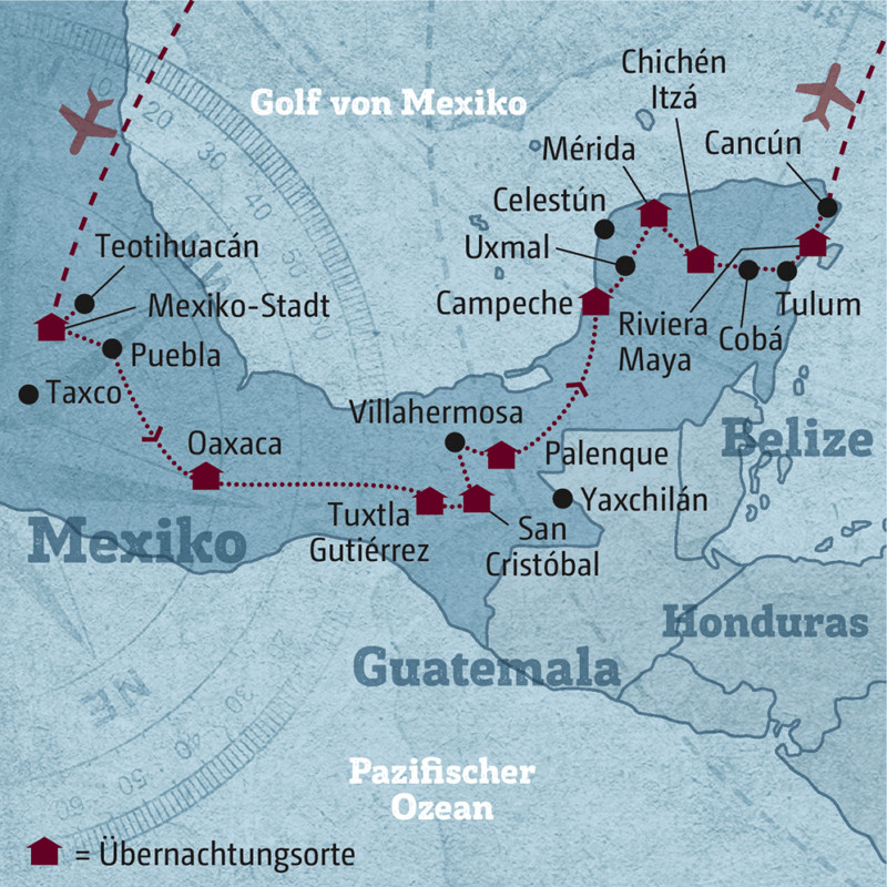 Die Idee dieser Reise: Mexiko umfassend erleben. Die vorgeschlagene Route unserer Länderexpertin führt Sie über Land von der Millionenmetropole Mexiko-Stadt zu den vom Urwald überwucherten Relikten der Mayas. Bis zum Horizont nichts als Häuser. Die idyllische Seite von MEXIKO-STADT erleben Sie in XOCHIMILCO. Lassen Sie sich von einem Gondoliere durch die Kanäle schippern, die die AZTEKEN einst als schwimmende Gärten anlegten. Auf der legendären PANAMERICANA passieren Sie meterhohe Säulenkakteen und riesige Felder mit Agaven. Von Ihrem einheimischen Scout erfahren Sie, dass aus ihrem Saft Mezcal gewonnen wird. Spätestens in OAXACA sollten Sie den Nationalschnaps probieren – entweder stilecht pur oder mit einer Limettenscheibe und Chilipulver. Nachdem Sie das Bergland verlassen haben, machen Sie sich über PALENQUE auf den Weg Richtung Yukatan-Halbinsel und besichtigen dort u.a. die berühmten Ruinen von CHICHÉN ITZÁ.