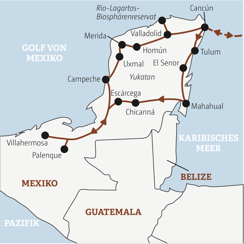 Vom Urwald verschlungene Städte, in den Baumwipfeln turnen die Brüllaffen. Wir erklimmen uralte Mayabauten, wischen uns oben den Schweiß von der Stirn und genießen den Blick in die Weite. Wir mixen uns einen Cocktail aus Stränden, bezaubernden Kolonialstädten und tropischer Tierwelt. Dazu eine schokoladige Verführung, feurige Snacks und tiefblaue Cenotes. Abenteuerinstinkt geweckt? Vamos!