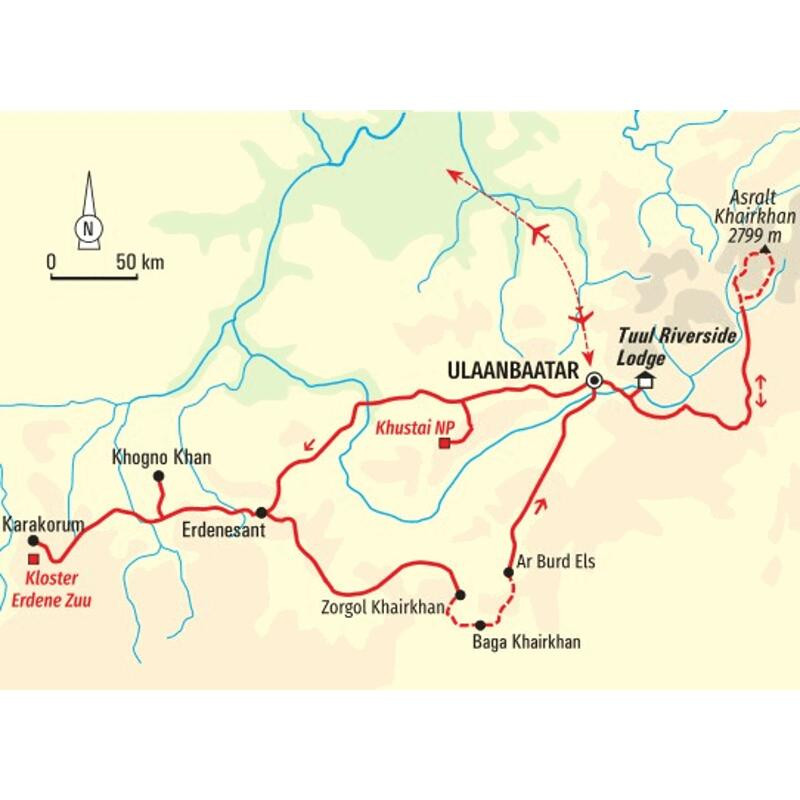 Trekkingreise in den Khan-Khentii-Nationalpark und mit Kamelen in die Wüste Gobi"Die absolute Stille hüllt mich ein, wie ein weicher Mantel. Kein Fluglärm, kein Auto, nicht mal ein Vogel ist zu hören. Alles ist weit weg, es gibt nur mich, die braunen Felsen, die endlose Weite, die Geier über mir und den harten Stein unter mir. Kein Gestern und kein Morgen, nicht mal den nächsten Moment. Nur hier und jetzt. Dankbar für den Luxus des Augenblicks." (Hauser-Reiseteilnehmer) Die Mongolei ist untrennbar mit dem Namen Dschingis Khan verbunden, dabei hat das Land weit mehr zu bieten als Mythen und Legenden um den bedeutenden Herrscher. Wir folgen den Spuren der Geschichte, ziehen mit Kamelen und Pferden durch die eindrucksvolle Steppe und lassen uns von der endlosen Weite in ihren Bann ziehen. Wir machen uns mit den Nomaden zu Fuß auf den Weg durch den Khan-Khentii-Nationalpark, ziehen durch die dichten Wälder und breiten Täler bis wir die Berge erreichen. Der Anstieg auf den Asralt Khairkhan lohnt sich – wir werden nicht nur mit einem atemberaubenden Rundumblick belohnt, sondern auch in die Geheimnisse der Obos eingeweiht. Im Khustai-Nationalpark erwartet uns ein anderes Gesicht des Landes. In der einmaligen Hügellandschaft sehen wir mit etwas Glück die seltenen Przewalski-Pferde. Der volle Kontrast dazu erwartet uns in den Sanddünen von Ar Burd Els – besonders bei Nacht, wenn der Sternenhimmel unser Camp beleuchtet. Wir lernen das Leben der Nomaden hautnah kennen, bekommen Einblicke in den Schamanismus der Steppe und spüren, wie die Moderne ihren Einzug in Ulaanbaatar hält. Und dabei fühlen wir uns stets als willkommene Gäste in der Weite.