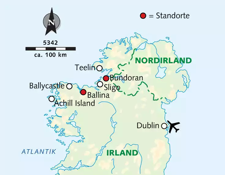 1. Tag: Welcome to IrelandAnkunft in Dublin. Von hier geht es in den wilden Westen nach Ballina im County Mayo (5 Ü, Fahrdauer: ca. 3 1/2 Std.). Für den Termin am 05.07.26 ist die Übernachtung in Belmullet vorgesehen (Fahrdauer: ca. 4 1/2 Std.).