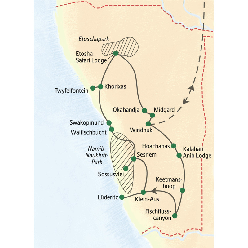 - 15 Übernachtungen im Doppelzimmer, Hotels und Lodges mit Klimaanlage und Swimmingpool (außer in Swakopmund)