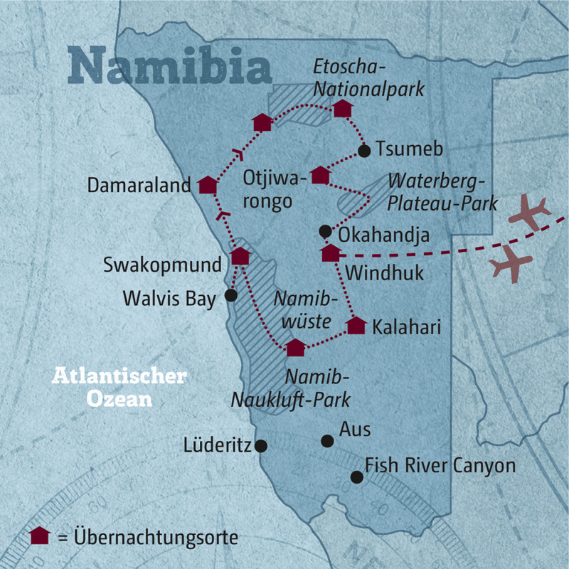 Die Idee dieser Selbstfahrerreise: eine tolle Einsteigertour mit vielen landschaftlichen Highlights und ein paar Relaxtagen in Swakopmund. Wenn Sie das Abenteuer lieben und ein wenig Offroad-Erfahrung haben, ist die vorgeschlagene Route unserer Länderexpertin genau das Richtige für Sie. Wasservorräte und Treibstoff besorgen und dann kann es losgehen Richtung KALAHARI. Am Nachmittag erkunden Sie mit einem Ranger die Gegend: Wussten Sie, dass die nächsten Verwandten der niedlichen Erdmännchen Hyänen sind? Pures Allradvergnügen im NAMIB-NAUKLUFT-PARK mit den höchsten Dünen der Welt. Wenn Sie gehörig Luft aus den Reifen lassen, haben Sie selbst auf der weichen Sandpiste genügend Grip. Im ETOSCHA-NATIONALPARK lassen Sie das Mietauto stehen. Ein Ranger und ein Tracker spüren vier der Big Five für Sie auf. Hoffentlich sagen die beiden irgendwann: "You are lucky!" Denn Leoparden sichtet man hier so gut wie nie.