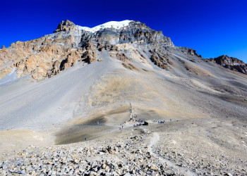 Tag 12 Passüberschreitung des Thorong La und Wanderung nach MuktinathDer anstrengendste, aber wohl auch spektakulärste Teil der Tour steht bevor: die Überquerung des Thorong La. Heute müssen wir die lange Etappe bis Muktinath bewältigen. Noch vor Tagesanbruch geht es mit Stirnlampen los. Der Weg führt in Serpentinen über steiniges Gelände hinauf zu einer großen Seitenmoräne. Seit Jahrhunderten wird dieser Weg von den Einheimischen zu Fuß und zu Pferd benutzt. Es ist sehr wichtig, langsam und stetig zu gehen. Erschwerend können sich die Höhe und möglicher Schneefall oder schneebedeckte Wege auswirken. Je nach Kondition, Höhenanpassung und Wetter benötigen wir ca. 4 - 6 Std. für die 1.000 Höhenmeter, bevor wir auf der mit Steinpyramiden und flatternden Gebetsfahnen geschmückten Passhöhe (5.416 m) stehen. Bei gutem Wetter bietet sich uns ein prachtvolles Panorama. Auf beiden Seiten des Passes thronen schneebedeckte 6.000er. Eine Pause im Teehaus am Pass (falls geöffnet) belohnt uns für die Strapazen des Aufstiegs. Der Abstieg verläuft erst gemächlich, dann steiler bergab. Über Geröllfelder erreichen wir den Beginn des Hochtales und wandern über den begrünten Talboden nun hinab nach Muktinath (3.800 m). Über 1.600 Höhenmeter geht es bergab, bis wir nach ca. 3 - 4 Std. in einer Lodge im berühmten Pilgerort eintreffen.