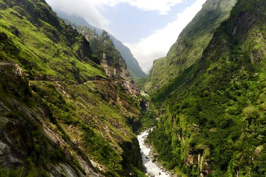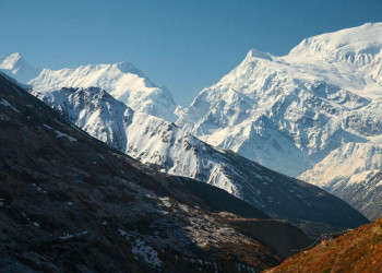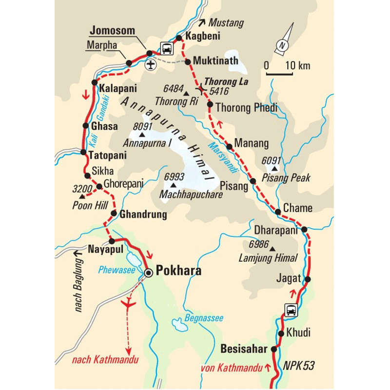 Trekkingreise rund um das Annapurna-Massiv über den Thorong LaAuf der Hängebrücke herrscht Trubel. Schwer bepackte Mulis überqueren das schaukelnde Metallgitter. Während wir die Tiere vorbei trotten lassen, trägt der Wind die segensreichen Worte der bunten Gebetsfahnen in den Himmel. Noch übertönt das Tosen der Wasserfälle die Stille – aber nicht mehr lange. Einatmen. Ausatmen. Loslassen. Wir machen uns auf den Weg und folgen einer der schönsten Trekkingrouten Nepals, dem Annapurna Circuit, der uns einmal rund um das Annapurna Himal führt. Los geht’s über sattgrüne Reisterrassen hinter Jagat, weiter entlang des subtropischen Marsyangdi-Tals und durch luftige Strauchwälder in der Hochebene von Manang. Wir verinnerlichen den Rhythmus der Berge, stumm begleitet von den gewaltigen Achttausendern. Am Thorong-Pass wird die Landschaft immer alpiner, grauer Fels schiebt sich in Szene und Schneefelder sind auch im Sommer keine Seltenheit. Je weiter wir nach Norden kommen, desto stärker prägt der Buddhismus das mehrheitlich hinduistische Nepal. Wir begegnen in Muktinath beiden Religionen, lernen die heilige Quelle und das ewige Feuer kennen und begutachten in Kagbeni die trutzige Gompa im mittelalterlichen Bergdorf. Schon in Tatopani wird die Natur wieder grüner, Farndschungel und Fichtenwälder drängen sich ins Bild. Wir bewundern die unnahbare Annapurna und den majestätischen Machhapuchare von allen Seiten, vom Aussichtspunkt am Poon Hill erleuchten die Himalaya-Riesen zum Sonnenaufgang besonders imposant. Und wenn wir schließlich in Pokhara am Phewa-See die letzten Tage Revue passieren lassen, sind wir sicher – die Umrundung der Annapurna ist ein spektakuläres Erlebnis.