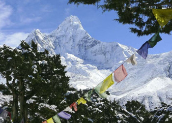 Trekkingreise zum Everest Base Camp und zum Panoramagipfel Kala PattarWie ein breites weißes Band schlängelt sich der Dudh Kosi durch das "Tal des Milchflusses". Links und rechts erheben sich die Felswände, der Pfad geht langsam aber stetig bergauf. Trekker, Träger und Tragetiere tummeln sich auf dem Weg und auch auf den Hängebrücken herrscht reges Treiben – besonders auf der Hillary-Brücke, die hoch über dem Canyon im Wind schaukelt. Die wehenden Gebetsfahnen sind so bunt wie die Häuser in den Dörfern entlang des Weges. Wir widmen uns der Geschichte und Entwicklung der Everest-Region, machen uns in Namche Bazar mit der Kultur der Sherpa vertraut, besuchen in Khunde das Sir Edmund Hillary Hospital und in Pangboche das Wiederaufforstungsprojekt "Ein Tag – ein Baum". Unser Trekking führt uns durch den Sagarmatha-Nationalpark, die Heimat der höchsten Berge der Welt. Wir folgen der klassischen Route durch die Sherpa-Dörfer hinauf zum Everest Base Camp, bewundern von Khumjung die Aussicht auf die formschöne Ama Dablam und von Tengboche den Blick auf die weiteren Eisriesen der Khumbu-Region. Der Höhenweg oberhalb des Pheriche-Tales führt uns zum Khumbu-Gletscher und weiter durch die Mulde der Lobuche-Berge auf die Hochalm Gorak Shep. Von hier geht es aber noch höher hinauf: Wir erklimmen den Gipfel des Kala Pattar und genießen vom "schwarzen Berg" die "weiße Aussicht". Vor uns liegt die Everest-Pyramide in scheinbar greifbarer Nähe. Unter uns erstreckt sich die Eiswelt des Changri-Gletschers und neben uns strahlt die kantige Spitze des Nuptse in der Sonne. Nicht nur die Höhe, auch der Anblick raubt uns den Atem – umringt von den höchsten Bergen der Welt.