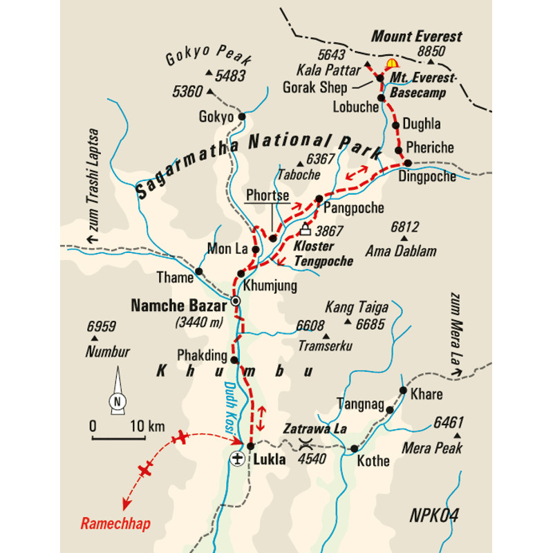 Trekkingreise zum Everest Base Camp und zum Panoramagipfel Kala PattarWie ein breites weißes Band schlängelt sich der Dudh Kosi durch das "Tal des Milchflusses". Links und rechts erheben sich die Felswände, der Pfad geht langsam aber stetig bergauf. Trekker, Träger und Tragetiere tummeln sich auf dem Weg und auch auf den Hängebrücken herrscht reges Treiben – besonders auf der Hillary-Brücke, die hoch über dem Canyon im Wind schaukelt. Die wehenden Gebetsfahnen sind so bunt wie die Häuser in den Dörfern entlang des Weges. Wir widmen uns der Geschichte und Entwicklung der Everest-Region, machen uns in Namche Bazar mit der Kultur der Sherpa vertraut, besuchen in Khunde das Sir Edmund Hillary Hospital und in Pangboche das Wiederaufforstungsprojekt "Ein Tag – ein Baum". Unser Trekking führt uns durch den Sagarmatha-Nationalpark, die Heimat der höchsten Berge der Welt. Wir folgen der klassischen Route durch die Sherpa-Dörfer hinauf zum Everest Base Camp, bewundern von Khumjung die Aussicht auf die formschöne Ama Dablam und von Tengboche den Blick auf die weiteren Eisriesen der Khumbu-Region. Der Höhenweg oberhalb des Pheriche-Tales führt uns zum Khumbu-Gletscher und weiter durch die Mulde der Lobuche-Berge auf die Hochalm Gorak Shep. Von hier geht es aber noch höher hinauf: Wir erklimmen den Gipfel des Kala Pattar und genießen vom "schwarzen Berg" die "weiße Aussicht". Vor uns liegt die Everest-Pyramide in scheinbar greifbarer Nähe. Unter uns erstreckt sich die Eiswelt des Changri-Gletschers und neben uns strahlt die kantige Spitze des Nuptse in der Sonne. Nicht nur die Höhe, auch der Anblick raubt uns den Atem – umringt von den höchsten Bergen der Welt.
