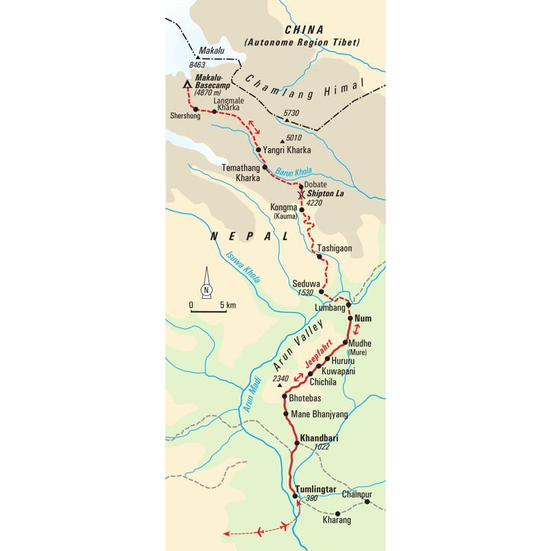 Trekkingreise im Osten Nepals zum Makalu-BasislagerÜppig-grüner Regenwald umgibt die Siedlungen. In der Ferne kreischen kleine Affen, die sich von Baum zu Baum hangeln. Die Luft ist feucht und warm. Szenenwechsel: Mächtige Gletscher bahnen sich ihren Weg zwischen den Eisgipfeln der Bergkette. Die wuchtige Makalu-Südwand blickt stumm auf das Geschehen. Mehr Kontrast geht nicht – der Makalu-Trek zeigt viele Gesichter. Einsame Wege führen uns im Osten Nepals in den Makalu-Barun-Nationalpark, in dem wir durch unterschiedliche ökologische Zonen wandern. Wir entdecken das subtropische Arun-Tal, das von warmem, terrassiertem Ackerland geprägt ist. Wir beobachten Bauern auf ihren Reisfeldern und beim Ernten von großen Bananenstauden. Vom Kongma-Pass genießen wir den Rundumblick, bevor wir über die Pässe Shipton und Keke das obere Barun-Tal erreichen. Wir sind in der subalpinen Zone, hier prägen steile Granitklippen und spektakuläre Wasserfälle die Landschaft – so abgelegen, dass sogar Schneeleoparden meist unbemerkt durch die Berge streifen. Durch dichten Rhododendron- und Nebelwald wandern wir schließlich in alpines Gelände, wo uns Wiesen voller Kräuter, Gräser und Wacholder erwarten und wo die Sherpa ihre Yaks weiden lassen. Nun ist es nicht mehr weit bis ins Basislager auf 4.870 m. Vor uns erheben sich die markanten Fels- und Eiswände des Makalu, des fünfthöchsten Berg der Erde und die leuchtend weißen Gipfel über uns scheinen zum Greifen nahe. Und wenn unser Blick über die Gletscher von Mount Everest und Lhotse schweift, wird der Kontrast zum Grün des durchwanderten Flusstals noch eindrucksvoller. Trekking zum Makalu Basislager – die Gegensätze ziehen uns an.