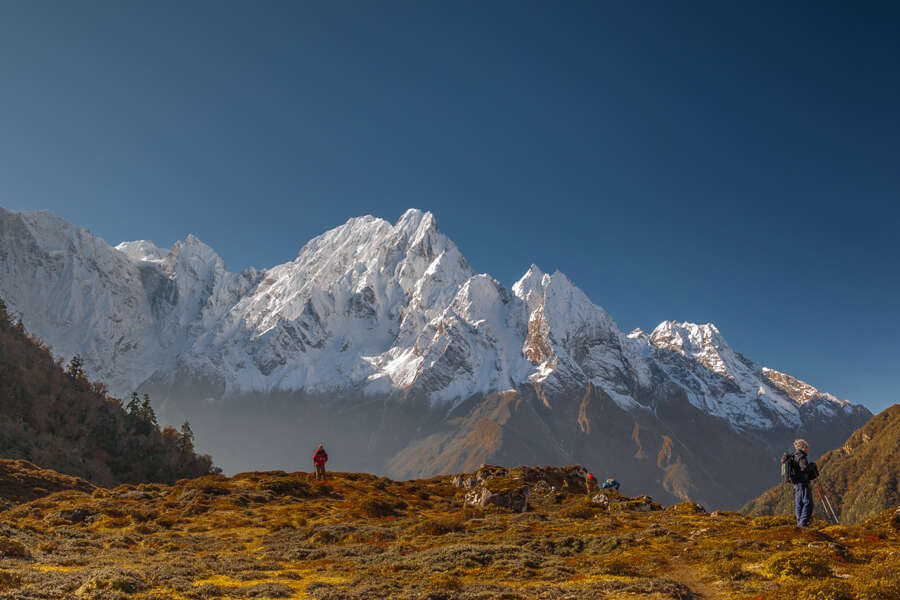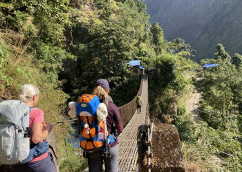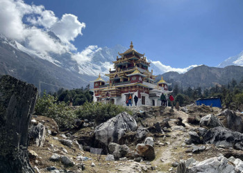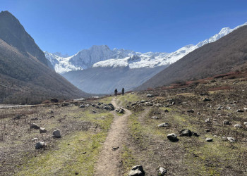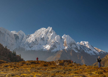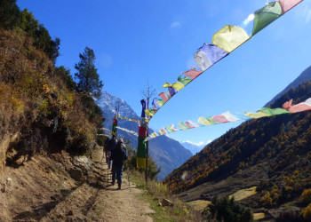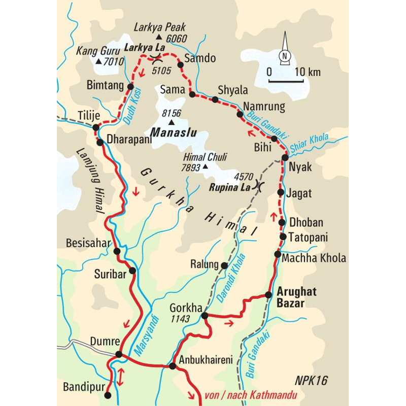 Trekkingreise rund um den "Berg der Seele" an der Grenze zu TibetWie ein weißer Pfeil ragt die Doppelspitze des Manaslu in den dunkelblauen Himmel. Buddhistische Gedenkschreine mit vergoldeten Spitzen und sorgsam aufgeschichtete Steinplatten mit dem eingemeißelten Mantra "Om mani padme hum" weisen den Weg rund um den "Berg der Seele". Links und rechts auf den Feldern werden Mais und Getreide angebaut. Frauen in bunten Saris und beladene Maultiere nutzen den alten Handelspfad, auf dem einst die Yak-Karawanen Holz nach Tibet brachten und mit Salz zurückkehrten. Wir wandern vom Dorf Soti Khola aus durch fruchtbare Reisterrassen, folgen dem Pfad entlang des Buri-Gandaki-Flusses und begegnen dabei immer wieder grasenden Yaks. Monotoner Gesang von Mönchen lockt uns ins Innere eines Klosters und offenbart uns Geheimnisse der tibetischen Kultur. Die Grenze in das Nachbarland Tibet ist von hier nur einen Steinwurf entfernt. Auf unserem Weg wechselt die Vegetation von Rhododendron- und Bambuswäldern mit weißen Orchideen zu Fichten- und Tannenwäldern mit dichtem Unterholz. Im Hintergrund scheinen der Schnee und das ewige Eis des Singri-Gletschers fast unwirklich. Plötzlich dringt das Geräusch der im Wind flatternden Gebetsfahnen an unser Ohr, dann erblicken auch unsere Augen das bunte Gewirr aus Fähnchen: Wir stehen am Pass, dem 5.105 m hohen Larkya-Pass, und staunen über das grandiose Bergpanorama. Über die malerischen Gurung-Dörfer im Tal des Dudh Kosi erreichen wir schließlich das Marsyangdi-Tal, das Ende unseres Treks. Der Geist des Manaslu mit seinem majestätischen Gipfel begleitet uns zurück nach Kathmandu – und sicher auch bis in die Heimat.