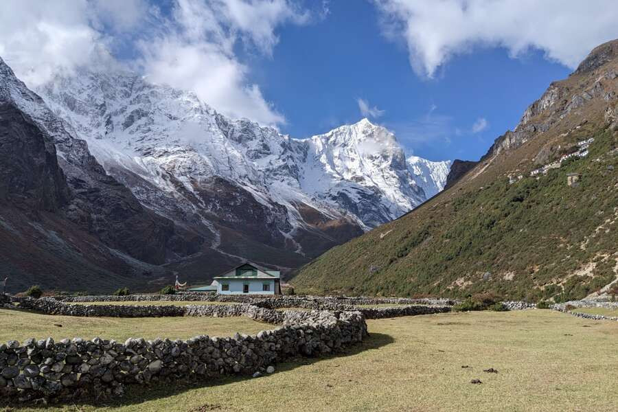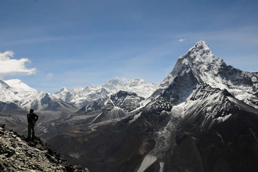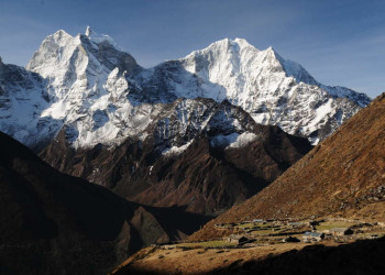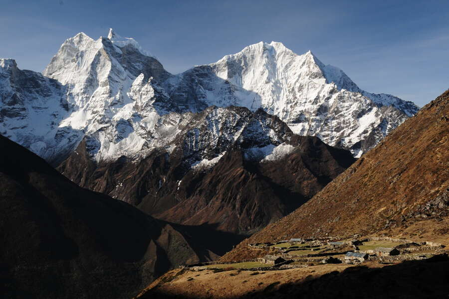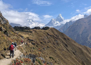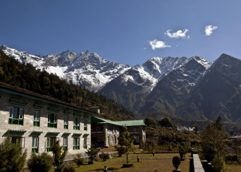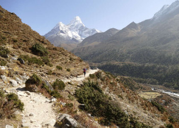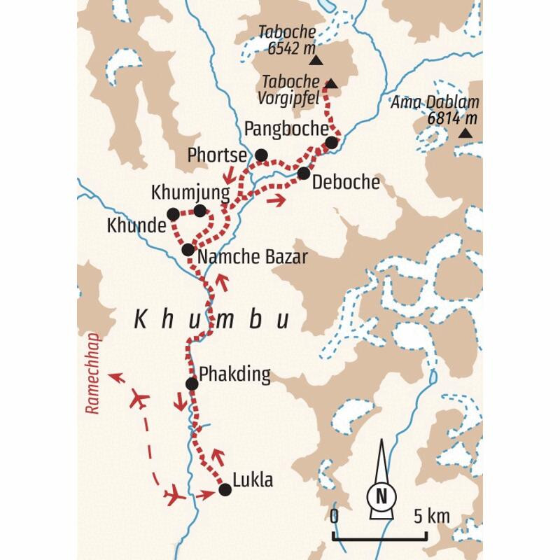 Trekkingreise im Khumbu-Gebiet von Lukla bis nach Pangboche mit Übernachtung in Komfort-LodgesDie Bergriesen Thamserku und Kongde Ri erheben sich mächtig über dem Sherpa-Zentrum Namche Bazar. Die Ama Dablam, das Wahrzeichen der Kumbu-Region, wacht stumm über die Kulisse und die Gipfelpyramide des Mount Everest glüht im Abendrot. Kein Wunder, dass die Nepali glauben, die leuchtend weißen Gipfel seien Wohnsitze der Götter. In Lukla gelandet, führt uns von dort der Weg durch die Heimat der Sherpa, durch abgelegene Bergdörfer bis in das Herz des Khumbu-Gebietes zu den höchsten Bergen der Welt. Wir queren luftige, mit Gebetsfahnen geschmückte Hängebrücken über den milchigen Fluss Dudh Kosi, schlendern durch das geschäftige Namche Bazar und genießen spektakuläre Ausblicke beim Anstieg auf einen mit Rhododendron bewachsenen Bergrücken in Richtung Tengboche. Und stets begleiten uns die stark verwurzelten Traditionen der Sherpas. Wir erblicken weiße Chörten und kunstvoll beschriftete Manimauern am Wegesrand, beobachten Mönche bei ihrem Gebetsritual und lernen in den Klöstern von Thame und Tengboche die buddhistische Kultur besser kennen. Auf der Terrasse unserer komfortablen Lodge in Deboche bleibt Zeit für Entspannung bei einem leckeren Tee – und im Ort Khumjung für die Bekanntschaft mit der Legende des Yeti. Am Taboche-Vorgipfel lässt sich über ein beeindruckendes 360-Grad-Panorama staunen. Zurück in Kathmandu steigen wir zur Tempelanlage von Swayambhunath hinauf, beobachten die untergehende Sonne am weißen Stupa und konzentrieren unsere Gedanken noch einmal auf die vergangenen Tage. Ob auf Tuchfühlung mit den Gipfeln des Himalaya oder an heiligen Pilgerorten – einprägsame Momente sind in Nepal garantiert.