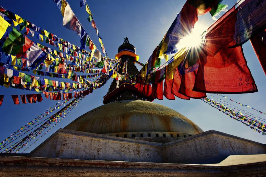 Reges Treiben herrscht in den Straßen von Kathmandu, wo Straßenverkäufer unermüdlich ihre Waren anpreisen. Pilger drehen murmelnd ihre Gebetsmühlen, während aus den Lautsprechern der Tempel Mantras in Dauerschleife erklingen. Dazu flattern bunte Gebetsfahnen im Wind. Im Geländewagen erkunden wir den Chitwan-Nationalpark, und in Pokhara am Phewasee grüßen am Horizont glitzernd die Eisriesen des Himalayas in der Sonne. Ein Besuch Bhaktapurs rundet die Reise königlich ab.