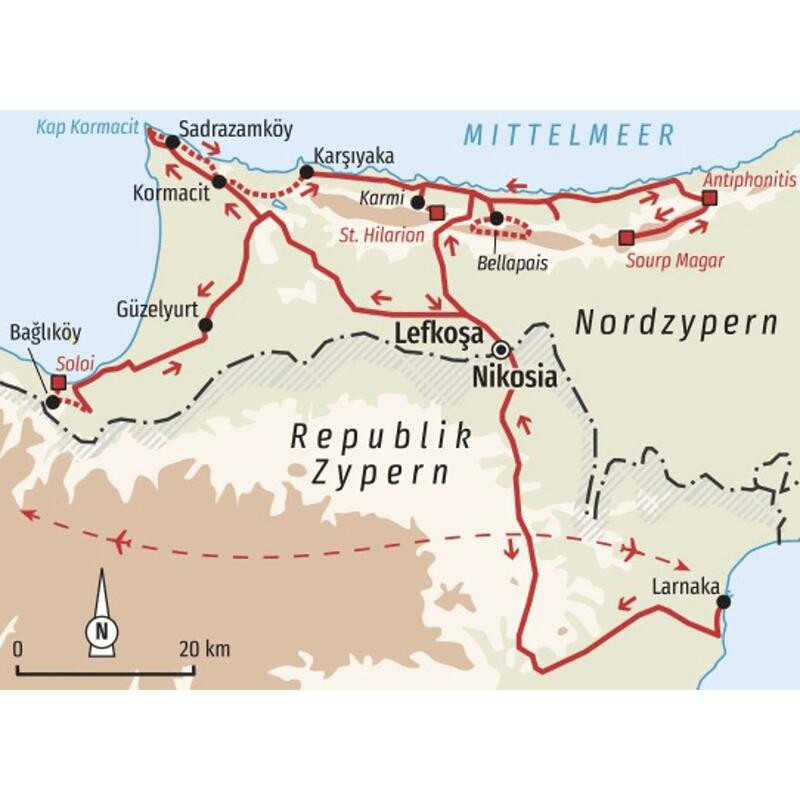 Wanderreise durch den Norden Zyperns von West nach Ost entlang des Besparmak-GebirgesDer schmale Ziegenpfad windet sich in die Höhe. Pistazien- und Johannisbrotbäume säumen den Weg, die Blätter rascheln gleichmäßig im Wind. Auf einem kleinen Plateau spendet ein uralter Olivenbaum Schatten. Unser Weg führt hinauf zur Festung St. Hilarion, die in atemberaubender Lage auf steilen Kalkfelsen des Fünf-Finger-Gebirges thront. Wir blicken weit über das tiefblaue Mittelmeer und tief in die turbulente Geschichte Nordyzperns. Das geteilte Land steckt voller Gegensätze, vereint durch eine eindrucksvolle Naturlandschaft. Wir wandern durch dichte Pinienwälder, streifen durch die jahrhundertealten Olivenhaine und machen Rast unter Lorbeerbäumen. Der Küstenpfad vom Kap Kormatitis führt uns auf einen Bergkamm mit toller Aussicht, der geröllige Pfad bei Karmi durch eine steinige Schlucht mit Ginsterbüschen und der Wanderweg am Gecitköy-Damm vorbei an Gemüsefeldern. Dabei entdecken wir nicht nur die kontrastreiche Natur, sondern auch eine breite Palette an Abwechslung für den Gaumen. Wir picknicken im Garten des Klosters Antiphonitis, lassen uns in Kormacit mit maronitischen Spezialitäten verwöhnen und mischen uns in einer Taverne in Arapköy unters Volk. Gegensätzlich wird es auch in Nikosia, der letzten geteilten Hauptstadt der Welt. Moscheen, Basare und orientalische Klänge erfüllen die Gassen im Norden, im Süden blinken moderne Leuchtreklamen in den Einkaufspassagen. Geteiltes Land, doppelte Kultur – die Gegensätze könnten kaum größer sein und doch vereinen sie sich auf eindrucksvolle Weise.Diese Reise lässt sich mit der Reise "Zypern - Troodos-Gebirge und Mittelmeer" kombinieren.