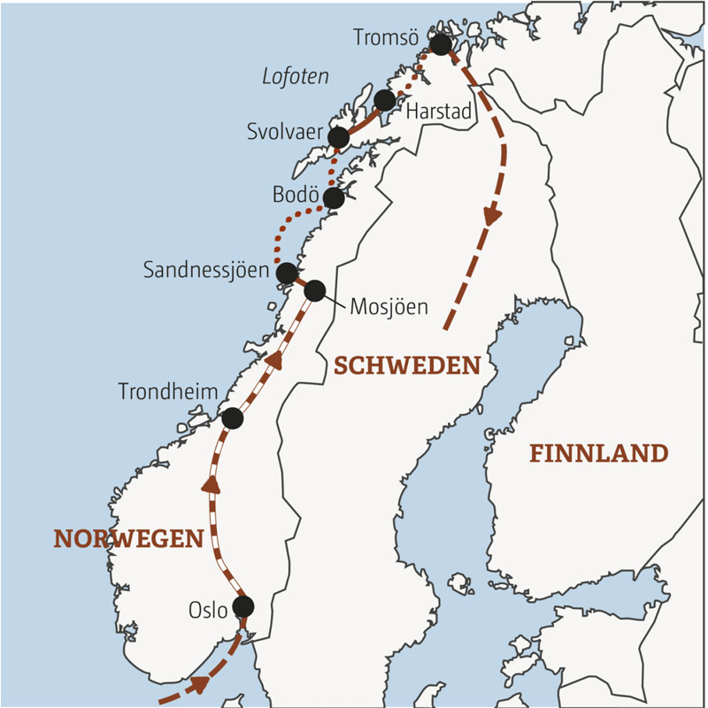 Norwegen im Wikinger-Style - wild, spritzig, spannend und dabei immer Kurs Nord haltend! Vom trendigen Oslo über studentisch quirlige Trondheim zu den markant-felsigen Lofoten und weiter per Insel-Hopping zu den Vesteraalen und schließlich nach Tromsö. Wir sind ganz local unterwegs, per Bahn durchs einsame Fjell, mit dem Linienbus über schwindelerregende Brücken und mit dem Postschiff an einer Küste entlang, die uns magnetisch an die Reeling ziehen wird!