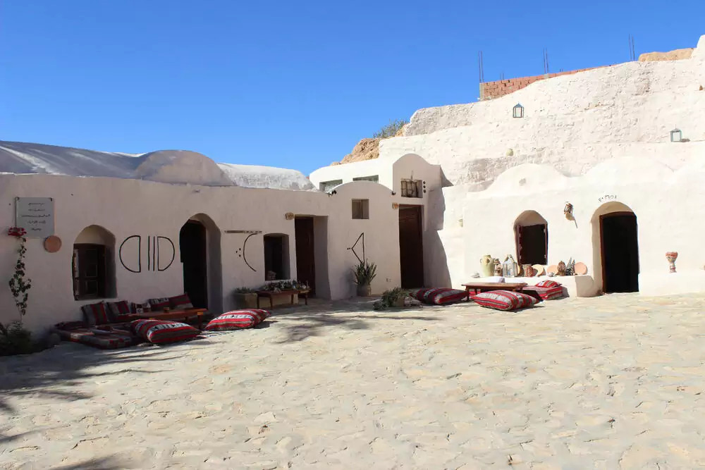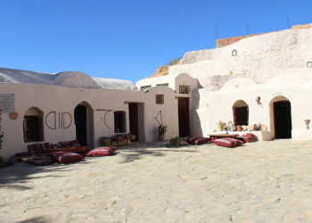 9. - 10. Tag: BerberdörferDie Welt der Berber lernen wir in einem Museum in Tamezret, bei Besichtigungen von Matmata und Medenine und einer Wanderung nach Cheninni kennen. GZ ca. 3 Stunden. Wie Amphitheater thronen die Dörfer auf Berghängen, die mit Wohngrotten und den Ksars, Burgen der Wüste, übersät sind. 2 Übernachtungen in einem Höhlenhotel in Douirette. 350 km. (2 x F, 2 x A)