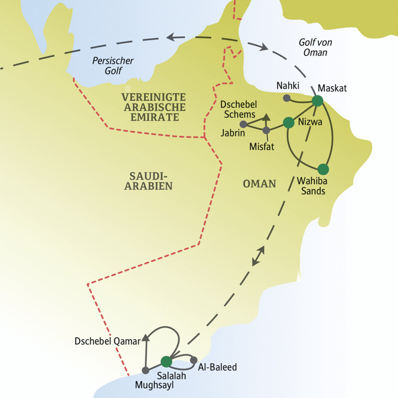 - Linienflug mit Oman Air (Economy, Tarifklasse L) von Frankfurt nach Maskat und zurück von Salalah, nach Verfügbarkeit