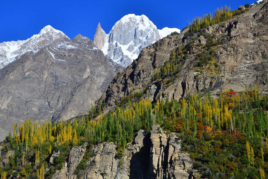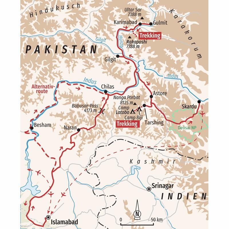 Trekkingreise zum Basislager des Rakaposhi, in das Hunzatal sowie zum Nanga ParbatErhaben thront das Baltit-Fort wie ein Adlerhorst über den grün leuchtenden Feldern. Der Palast strahlt in der Oase voller Apfel-, Aprikosen- und Kirschbäumen. Dazwischen wiegen schlanke Pappeln im Wind. Unser Blick schweift über die Dächer von Karimabad und das breite Hunzatal bis hinüber auf die schneebedeckten Bergkuppen und rauen Gletscher. Der mächtige Rakaposhi ragt im Panorama am höchsten auf. Wir befinden uns mitten in der beeindruckenden Gebirgslandschaft Nordpakistans mit seiner enormen Fülle an hohen Gipfeln. Hier treffen die Gebirgsketten Hindukusch, Karakorum und Himalaya aufeinander. Über das Indus-Tal erreichen wir die Region Gilgit-Baltistan, wo wir im Hunzatal das gastfreundliche und weltoffene Volk der Hunzukutz treffen, bekannt als geschickte Bergbauern und Meister im Anlegen von Bewässerungskanälen. Wir wandern hinauf zum Rakaposhi-Basislager, über den Gulkin-Gletscher zum schön gelegenen Borith-See – Blick auf die spektakulären Passu Peaks inklusive – und zu einem Aussichtspunkt über den türkisblauen Attabad-See. Weiter südlich widmen wir uns dem westlichsten Eckpfeiler des Himalayagebirges, dem Nanga Parbat. Von Tarshing im Rupaltal trekken wir über die Gletscher Chhungpar und Bazhin und zu den herrlich gelegenen Zeltplätzen und Basecamps der Herrligkoffer-Expeditionen der 70er und 80er Jahre. Von einem Grat aus bestaunen wir aus nächster Nähe die gewaltige Rupalflanke des Nanga Parbat. Bevor uns ein Flug von Skardu wieder zurück nach Islamabad bringt, wo wir auf dem Basar sicher das ein oder andere Souvenir erstehen können, führt uns eine abenteuerliche Fahrt durch den Deosai-Nationalpark und damit über die zweithöchste Hochebene der Welt. Die bezaubernden Landschaften Nordpakistans werden uns noch lange im Gedächtnis bleiben.
