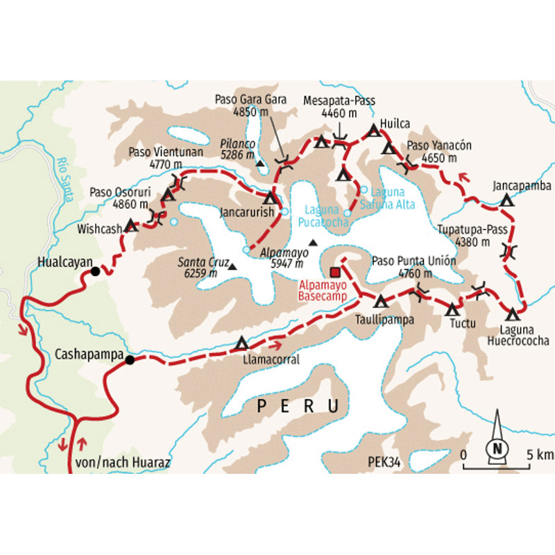 Trekkingreise im Norden Perus in der Cordillera Blanca"Ein Traumberg, wie ihn nur Kinder zu zeichnen wagen, die noch nie einen Berg gesehen haben", so schwärmte Günter Hauser, nachdem ihm 1957 mit seiner Gruppe die Erstbesteigung gelungen war. Unsere Träume schweifen tief in die peruanischen Anden, wo in der Cordillera Blanca einer der schönsten Gipfel der Welt thront – der Alpamayo (5.947 m). Die schneeweiße Pyramide mutet so perfekt an, dass man sie von allen Seiten betrachten möchte, wozu wir bei unserer Umrundung die Chance bekommen. In Huaraz brechen wir zum Trekking in der Cordillera Blanca auf und wandern vorbei an türkisblauen Lagunen bis ins Basislager des Alpamayo. Hier halten wir inne und versetzen uns gedanklich zurück in die Zeit, als Günter Hauser und seine Mannschaft den Gipfel das erste Mal fest im Blick hatten. Wir umrunden das "Matterhorn" der Anden, stets begleitet von einem beeindruckenden Gebirgspanorama um uns herum. Diese Anden-Gipfel führen uns die Dimensionen des Menschen in der Natur vor Augen. Der höchste Berg Perus vereinnahmt uns hier besonders: der legendäre Huascaran (6.768 m). Sein Anblick komplettiert diese unvergessliche Trekkingreise, ganz auf den Spuren unseres Firmengründers Günter Hauser.